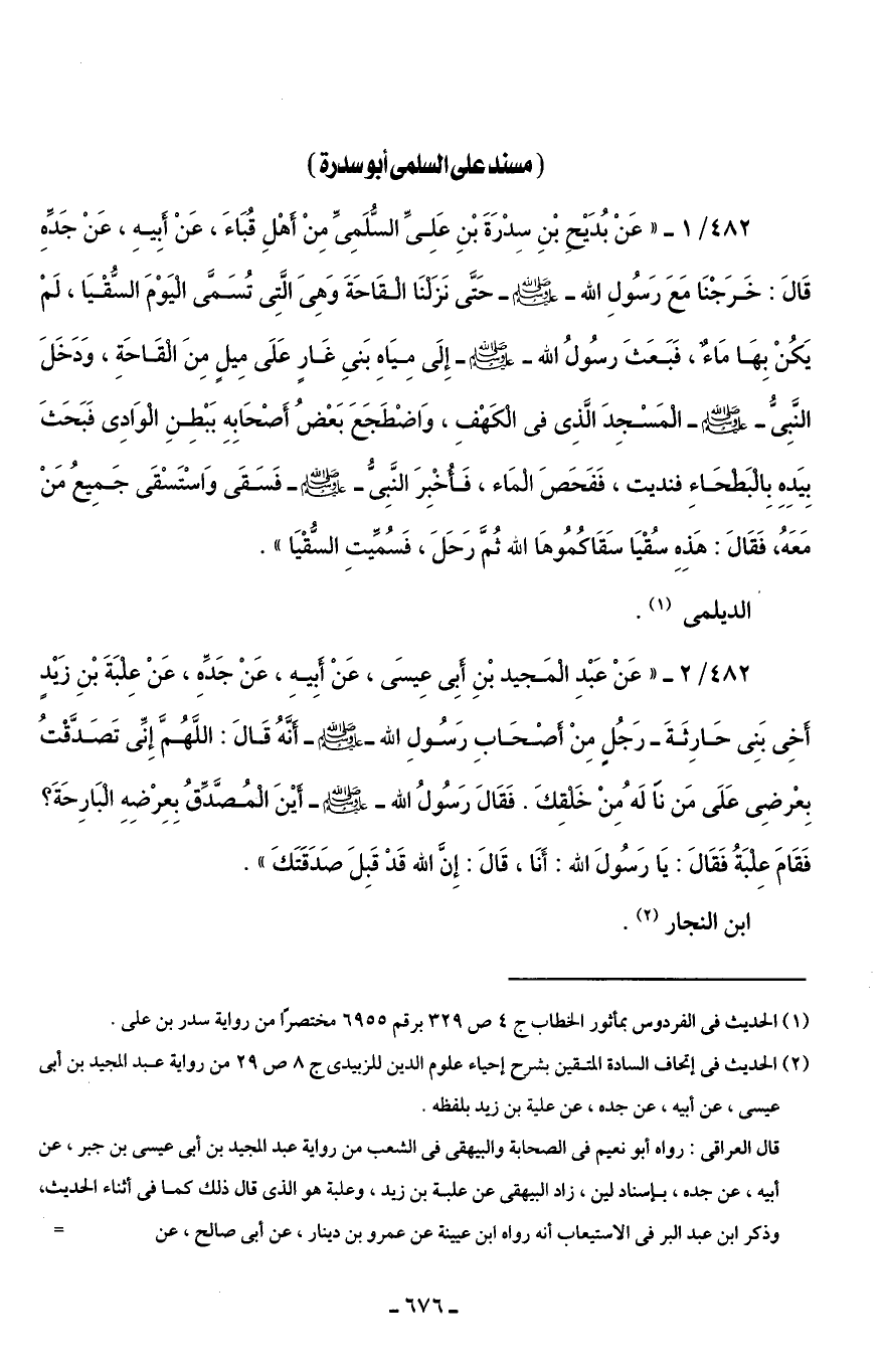482/ 1 - " عَنْ بُدَيْحِ بْنِ سِدْرَةَ بْنِ عَلِىِّ السُّلَمِىِّ مِنْ أَهْلِ قُبَاءَ، عَنْ أَبِيهِ، عَنْ جدِّهِ قَالَ: خَرَجْنَا مَعَ رَسُولِ الله - صلى الله عليه وسلم - حَتَّى نَزَلْنَا الْقَاحَةَ وَهِىَ الَّتِى تُسَمَّى الْيَوْمَ السُّقْيَا، لَمْ يَكُنْ بِهَا مَاءٌ، فَبَعَثَ رسُولُ الله - صلى الله عليه وسلم - إِلَى مِيَاهِ بَنىِ غَارٍ عَلَى مِيلٍ مِنَ الْقَاحَةِ، وَدَخَلَ النَّبِىُّ - صلى الله عليه وسلم - الْمَسْجِدَ الَّذِى في الْكَهْفِ، وَاضْطَجَعَ بَعْضُ أَصْحَابِهِ بَبْطِنِ الْوَادِى فَبَحَثَ بِيَدِهِ بِالْبَطْحَاءِ فنديت، فَفَحَصَ الْمَاء، فَأُخْبِرَ النَّبِىُّ - صلى الله عليه وسلم - فَسَقَى وَاسْتَسْقَى جَمِيعُ مَنْ مَعَهُ، فَقَالَ: هَذِهِ سُقْيَا سَقَاكُمُوهَا الله ثُمَّ رَحَلَ، فَسُمِّيتِ السُّقْيَا".