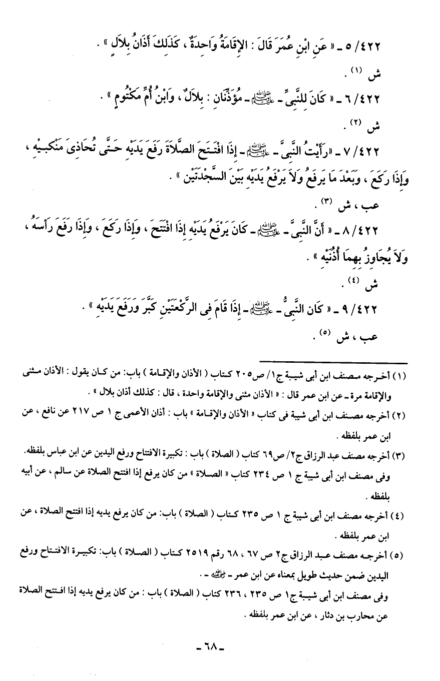422/ 5 - "عَنِ ابْنِ عُمَرَ قَالَ: الإِقَامَةُ وَاحِدَةٌ، كَذَلِكَ أَذَانُ بِلاَلٍ".