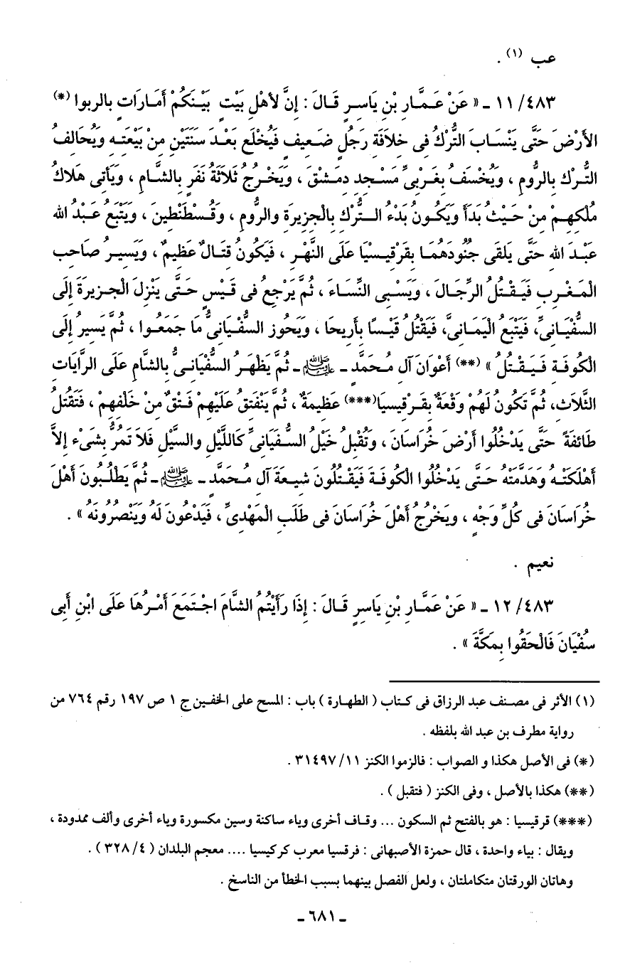 483/ 11 - "عَنْ عَمَّارِ بْنِ يَاسِرٍ قَالَ: إِنَّ لأهْلِ بَيْتٍ بَيْنَكُمْ أَمَارَاتٍ بالربوا (*) الأَرْضَ حَتَّى يَنْسَابَ التُّرْكُ فِى خِلَافَةِ رَجُلٍ ضَعِيفٍ فَيُخْلَع بَعْدَ سَنَتَيْنِ مِنْ بَيْعَتِهِ وَيُحَالِفُ التُّرْك بالرُّومِ، وَيُخْسَفُ بِغَرْبِىِّ مَسْجِدِ دِمَشْقَ، وَيَخْرُجُ ثَلَاثَةُ نَفَرٍ بِالشَّامِ، وَيَأتِى هَلاكُ مُلْكِهِمْ مِنْ حَيْثُ بَدَأَ وَيَكُونُ بَدْءُ التُّرْكِ بِالْجِزِيرَةِ والرُّوم، وَقُسْطَنْطِينَ، وَيَتْبَعُ عَبْدُ الله عَبْدَ اللهِ حَتَّى يَلقَى جُنُودَهُمَا بِقَرْقِيسْيَا عَلَى النَّهْرِ، فَيَكُونُ قِتَالٌ عَظيمٌ، وَيَسِيرُ صَاحِب الْمَغْرِبِ فَيَقْتُلُ الرِّجَالَ، وَيَسْبِى النِّسَاءَ، ثُمَّ يَرْجِعُ في قَيْسٍ حَتَّى يَنْزِلَ الْجزيرَةَ إِلَى السُّفْيَانِىِّ، فَيَتْبَعُ الْيَمَانِىَّ، فَيَقْتُلُ قَيْسًا بأَرِيحَا، وَيَحُوز السُّفْيَانِىُّ مَا جَمَعُوا، ثُمَّ يَسِيرُ إِلَى الْكُوفَةِ فَيَقْتُلُ" (* *) أَعْوَانَ آلِ مُحَمَّدٍ - صلى الله عليه وسلم - ثُمَّ يَظْهَرُ السُّفْيَانِىُّ بِالشَّامِ عَلَى الرَّايَاتِ الثَّلَاثِ، ثُمَّ تَكُونُ لَهُمْ وَقْعَةٌ بِقَرْقِيسيَا (* * *) عَظِيمَةٌ، ثُمَ يَنْفَتِقُ عَلَيْهِمْ فَتْقٌ مِنْ خَلفِهِمْ، فَتَقتُلُ طَائفَةً حَتَّى يَدْخُلُوا أَرْضَ خُرَاسَانَ، وَتُقْبِلُ خَيْلُ السُّفيَانِىَّ كَاللَّيْلِ والسَّيْلِ فَلَا تَمُرُّ بِشَىْء إِلَّا أَهْلَكَتْهُ وَهَدَّمَتْهُ حَتَّى يَدْخُلُوا الْكُوفَةَ فَيَقْتُلُونَ شِيعَةَ آلِ مُحَمَّدٍ - صلى الله عليه وسلم - ثُمَّ يَطْلُبُونَ أَهْلَ خُرَاسَانَ في كُلِّ وَجْهٍ، ويَخْرُجُ أَهْلَ خُرَاسَانَ في طَلَبِ المَهْدِىِّ، فَيَدْعُونَ لَهُ وَيَنْصُرُونَهُ".