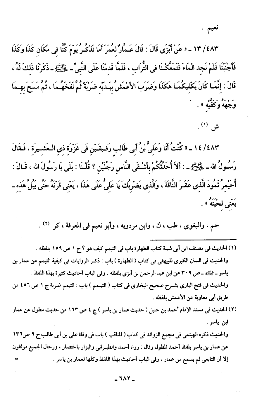 483/ 13 - "عَنْ أبزَى قَالَ: قَالَ عَمَّارٌ لِعُمَرَ أمَا تَذْكُرُ يَوْمَ كُنَّا فِى مَكَانِ كَذَا وَكَذَا فَأَجْنَبْنَا فَلَمْ نَجِد الْمَاءَ فَتَمَعَّكْنَا في التُّرَابِ، فَلَمَّا قَدِمْنَا عَلَى النَّبِىِّ - صلى الله عليه وسلم - ذَكَرْنَا ذَلِكَ لَهُ، قَالَ: إِنَّمَا كَانَ يَكْفِيكُمَا هَكَذَا وَضَرَبَ الأَعْمَشُ بِيَدَيْهِ ضَرْبَةً ثُمَّ نَفَخَهُمَا، ثُمَّ مَسَحَ بِهِمَا وَجهَهُ وَكفَّيْهِ".