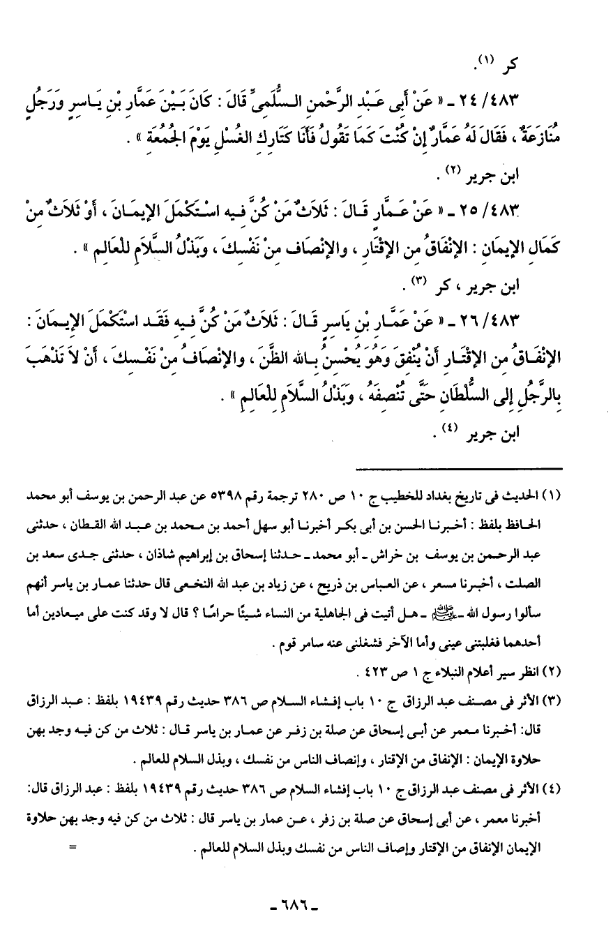 (¬3) الأثر في مصنف عبد الرزاق ج 10 باب إفشاء السلام ص 386 حديث رقم 19439 بلفظ: عبد الرزاق قال: أخبرنا معمر عن أبى إسحاق عن صلة بن زفر عن عمار بن ياسر قال: ثلاث من كن فيه وجد بهن حلاوة الإيمان: الإنفاق من الإقتار، وإنصاف الناس من نفسك، وبذل السلام للعالم.