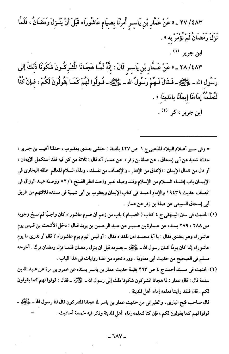 483/ 27 - "عَنْ عَمَّارِ بْنِ يَاسِرِ أُمِرْنَا بِصِيَامِ عَاشُورَاء قَبْلَ أَنْ يَنْزِلَ رَمَضَانُ، فَلَمَّا نَزَلَ رَمَضَانُ لَمْ نُؤْمَرْ بِهِ".