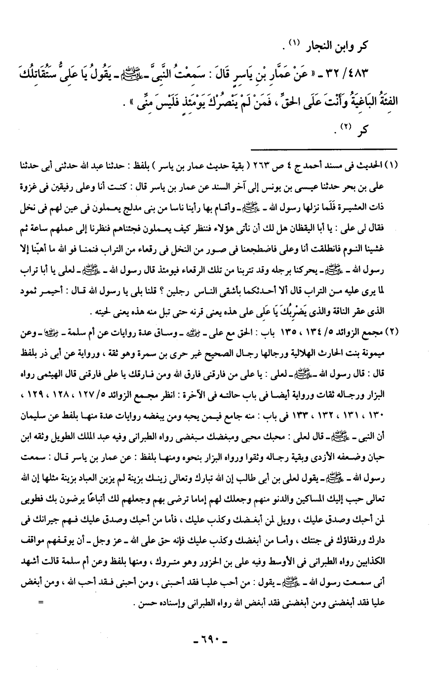 483/ 32 - "عَنْ عَمَّارِ بْنِ يَاسِرٍ قَالَ: سَمِعْتُ النَّبِىَّ - صلى الله عليه وسلم - يَقُولُ يَا عَلِىُّ سَتُقَاتِلُكَ الفِئَةُ البَاغِيَةُ وَأَنْتَ عَلَى الحقِّ، فَمَنْ لَمْ يَنْصُرْكَ يَوْمَئِذٍ فَلَيْسَ مِنِّى".