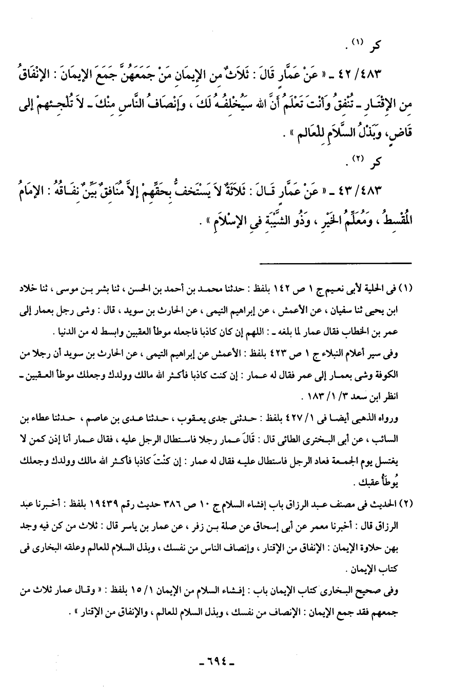 483/ 42 - "عَنْ عَمَّارٍ قَالَ: ثَلَاثٌ مِن الإِيمَانِ مَنْ جَمَعَهُنَّ جَمَعَ الإيمَانَ: الإنْفَاقُ مِن الإِقْتَارِ - تُنْفِقُ وَأنْتَ تَعْلَمُ أَنَّ الله سَيُخْلِفُهُ لَكَ، وَإنْصَافُ النَّاسِ مِنْكَ - لَا تُلْجِئهمْ إلى قَاضٍ، وَبَذْلُ السَّلَامِ لِلْعَالم".