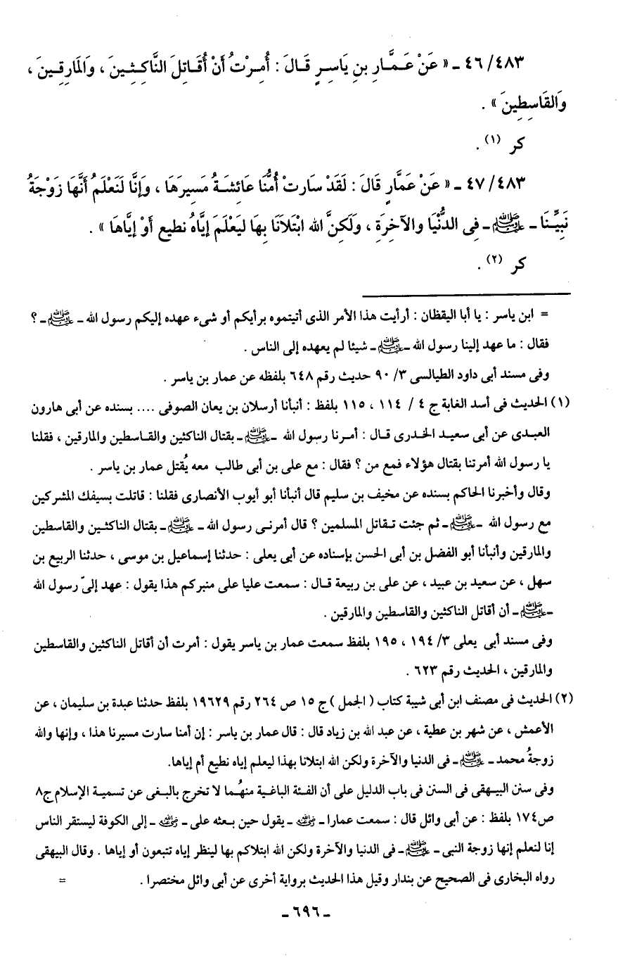 483/ 46 - "عَنْ عَمَّارِ بنِ يَاسِرٍ قَالَ: أُمِرْتُ أَنْ أُقَاتِلَ النَّاكِثِينَ، وَالمَارِقِينَ، وَالقَاسِطِينَ".