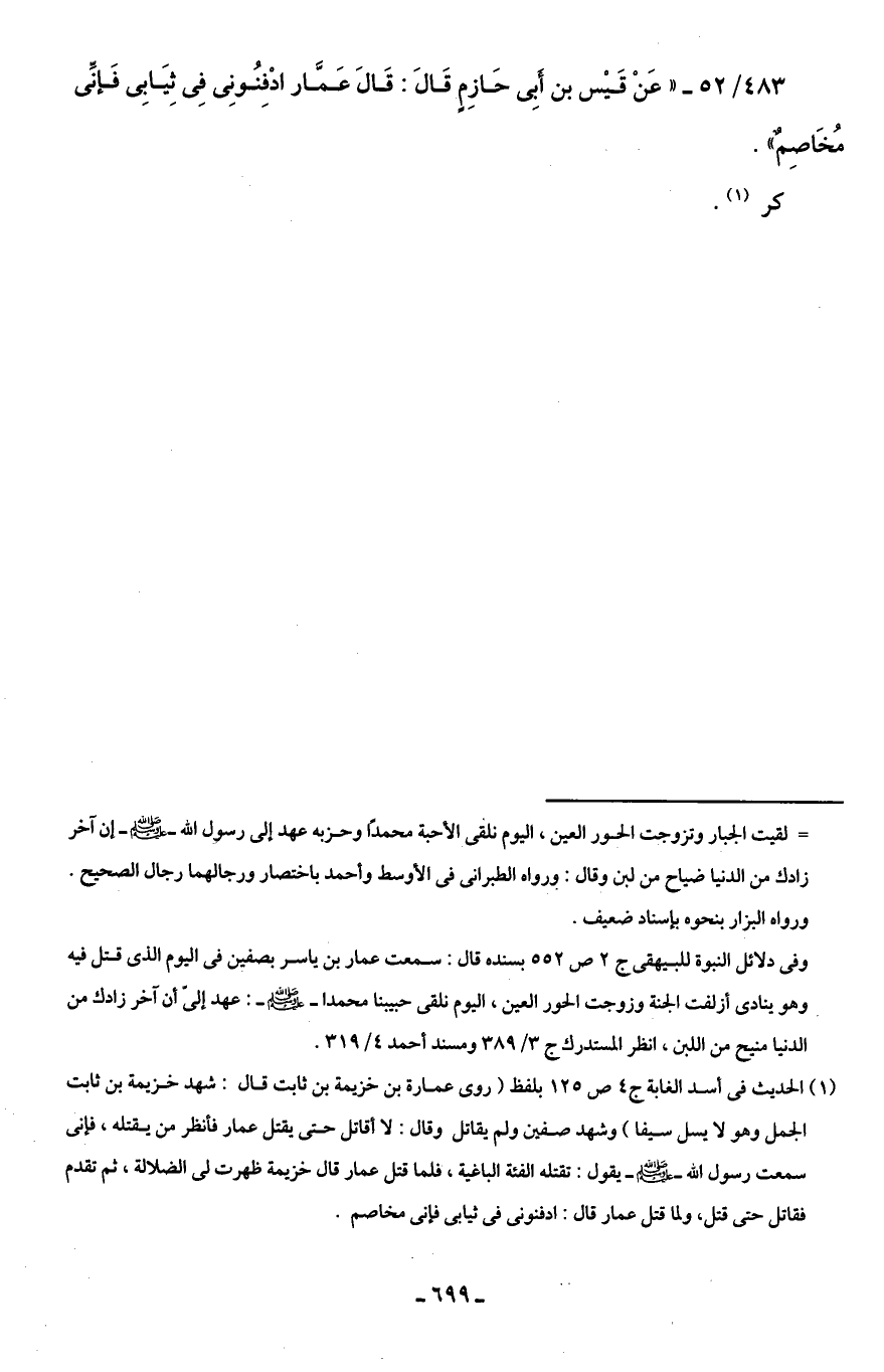 483/ 52 - "عَنْ قَيْس بن أَبِى حَازِمٍ قَالَ: قَالَ عَمَّار ادْفِنُونِى فِى ثِيَابِى فَإنَّى مُخَاصِمٌ".