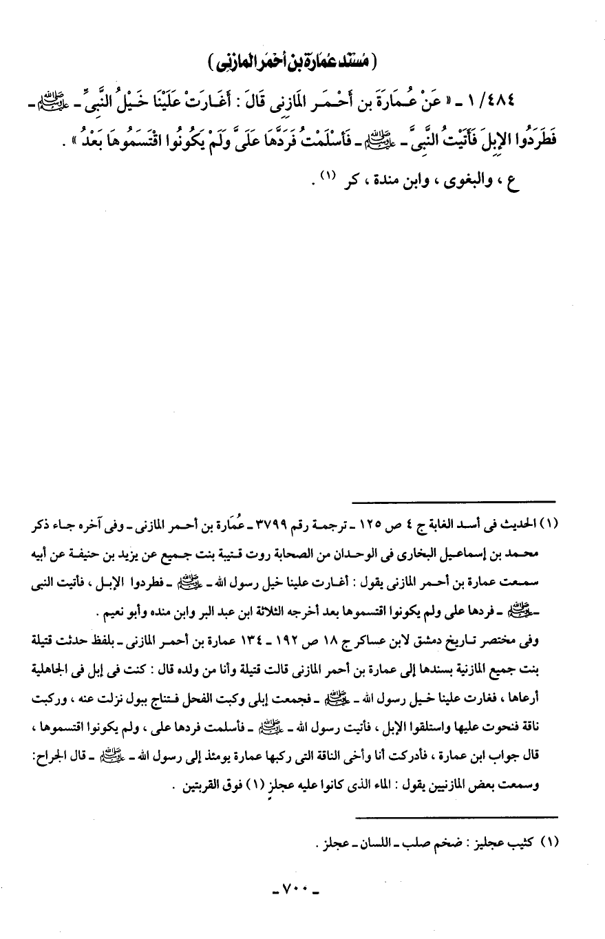484/ 1 - " عَنْ عُمَارَةَ بن أَحْمَر المَازِنِى قَالَ: أغَارَتْ عَلَيْنَا خَيْلُ النَّبِىِّ - صلى الله عليه وسلم - فَطَرَدُوا الإِبِلَ فَأَتَيْتُ النَّبِىَّ - صلى الله عليه وسلم - فَأسْلَمْتُ فَرَدَّهَا عَلَىَّ وَلَمْ يَكُونُوا اقْتَسَمُوهَا بَعْدُ".