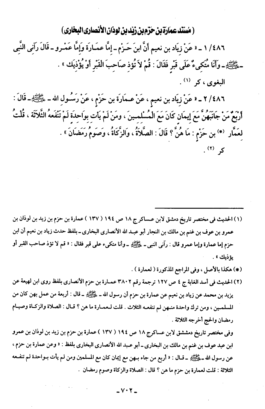 486/ 2 - "عَنْ زِيَاد بن نعيمٍ، عَنْ عمَارَة بن حَزْمٍ، عَنْ رَسُولِ الله - صلى الله عليه وسلم - قَالَ: أَرْبَعٌ مَنْ جَانَبَهُنَّ مَعَ إِيمَانٍ كَانَ مَعَ المُسْلِمِينَ، ومَنْ لَمْ يَأتِ بِوَاحِدَةٍ لَمْ تَنْفَعهُ الثَّلَاثَة، قُلْتُ لِعَمَّار (*) بن حَزْمٍ: مَا هُنَّ؟ قَالَ: الصَّلَاةُ، وَالزَّكَاةُ، وَصَومُ رَمَضَانَ".