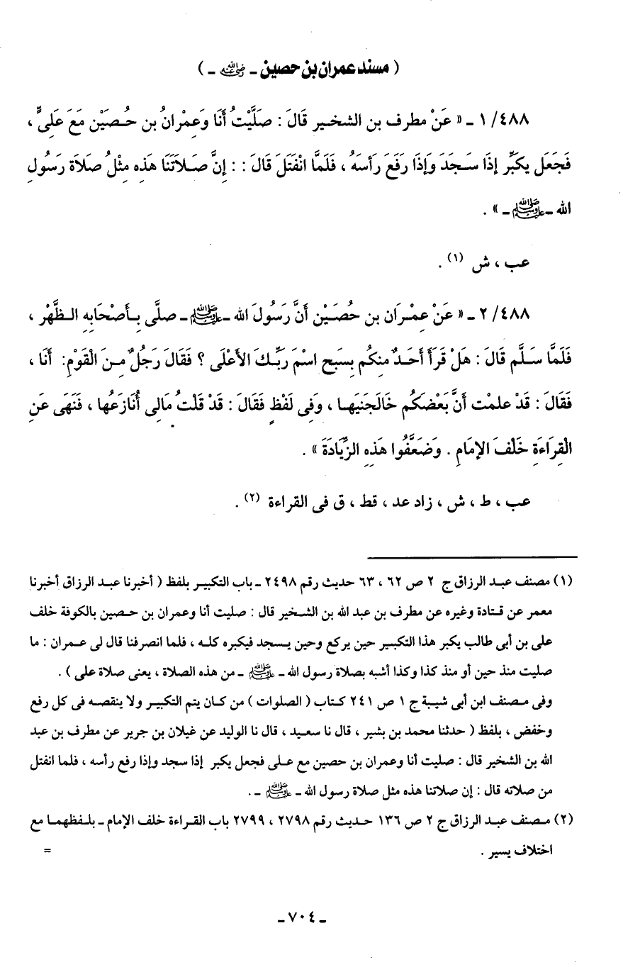 488/ 1 - " عَن مطرف بن الشخير قَالَ: صَلَّيْتُ أَنَا وَعِمْرانُ بن حُصَيْن مَعَ عَلِىٍّ، فَجَعَل يكَبَّر إذَا سَجَدَ وَإذَا رَفَعَ رَأسَهُ، فَلَمَّا انْفَتَلَ قَالَ: إِنَّ صَلَاتَنَا هَذِه مِثْلُ صَلَاة رَسُولِ الله - صلى الله عليه وسلم -".