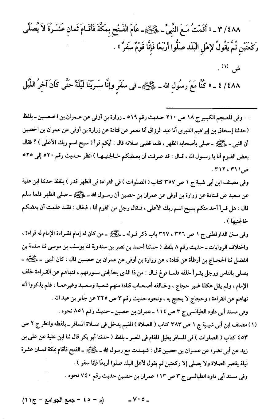 488/ 3 - "أقَمْتُ مَعَ النَّبِىِّ - صلى الله عليه وسلم - عَامَ الْفَتْحِ بِمَكَّةَ فَأَقَامَ ثَمانِ عَشْرَةَ لَا يُصَلِّى رَكْعَتَيْنِ ثُمَّ يَقُولُ لإهْلِ البَلَد صَلُّوا أَرْبَعًا فَإِنَّا قَوْمٌ سَفرٌ".