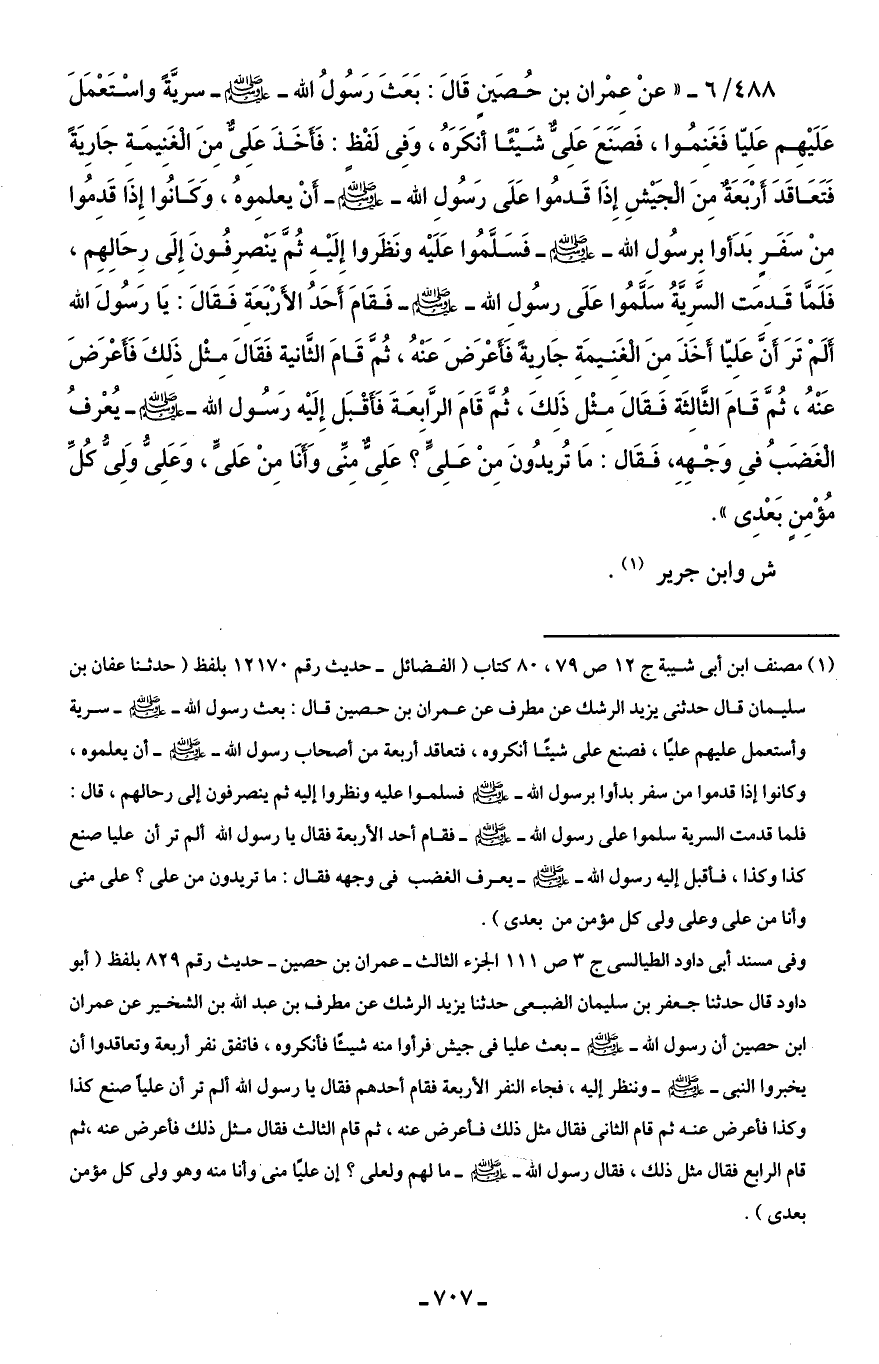 488/ 6 - "عنْ عِمْران بن حُصَينٍ قَالَ: بَعَثَ رَسُولُ الله - صلى الله عليه وسلم - سريَّةً واسْتَعْمَلَ عَلَيْهِم عَلِيّا فَغَنِمُوا، فَصَنَعَ عَلِىٌّ شَيْئًا أنكَرَهُ، وَفِى لَفْظٍ: فَأَخَذَ عَلِىٌّ مِنَ الْغَنِيمَةِ جَارِيَةً فَتَعَاقَدَ أَرْبَعَةٌ مِنَ الْجَيْشِ إِذَا قَدمُوا عَلَى رَسُولِ الله - صلى الله عليه وسلم - أَنْ يعلِموهُ، وَكَانُوا إِذَا قَدِمُوا مِنْ سَفَرٍ بَدَأوا بِرسُولِ الله - صلى الله عليه وسلم - فَسَلَّمُوا عَلَيْه ونَظَروا إِلَيْهِ ثُمَّ يَنْصرِفُونَ إِلَى رِحَالِهِم، فَلَمَّا قَدِمَت السَّرِيَّةُ سَلَّمُوا عَلَى رسُولِ الله - صلى الله عليه وسلم - فَقَامَ أَحَدُ الأَرْبَعَةِ فَقَالَ: يَا رَسُولَ الله أَلَمْ تَرَ أَنَّ عَلِيّا أَخَذَ مِنَ الْغَنِيمَةِ جَارِيةً فَأَعْرَضَ عَنْهُ، ثُمَّ قَامَ الثَّانية فَقَالَ مِثْل ذَلكَ فَأغْرَضَ عَنْهُ، ثُمَّ قَامَ الثَّالِثَة فَقَالَ مِثْل ذَلِكَ، ثُمَّ قَامَ الرَّابِعَةَ فَأَقْبَل إِلَيْه رَسُول الله - صلى الله عليه وسلم - يُعْرفُ الْغَضَبُ فِى وَجْهِهِ، فَقَال: مَا تُريدُونَ مِنْ عَلِىٍّ؟ عَلِىٌّ مِنِّى وَأَنَا مِنْ عَلىٍّ، وَعَلِىُّ وَلِىُّ كُلِّ مُؤْمِنٍ بَعْدِى".