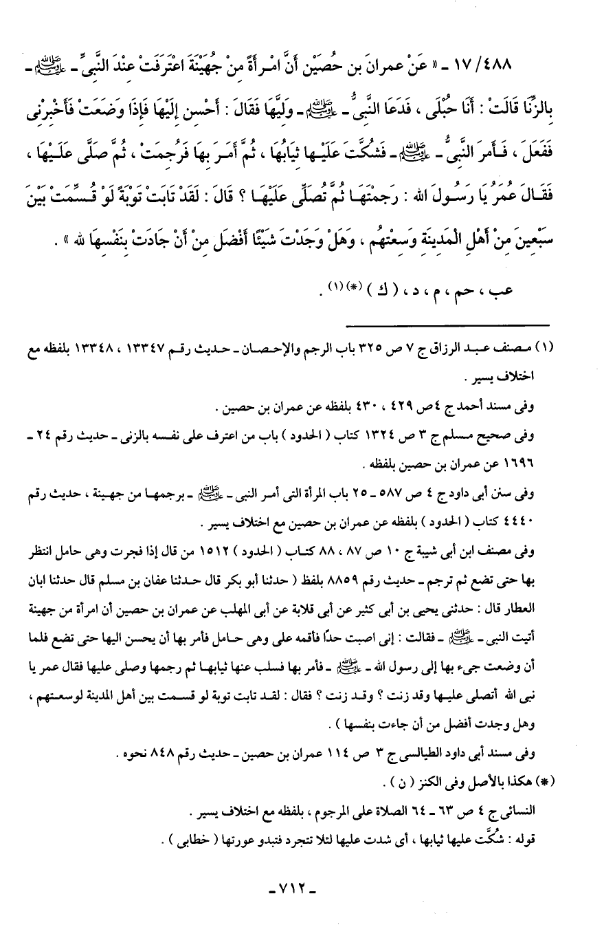 488/ 17 - "عَنْ عمرانَ بن حُصَيْن أَنَّ امْرأَةً مِنْ جُهَيْنَةَ اعْتَرَفَتْ عِنْدَ النَّبِىَّ - صلى الله عليه وسلم - بِالزَّنَا قَالَتْ: أَنَا حُبْلَى، فَدَعَا النَّبِىُّ - صلى الله عليه وسلم - وَلِيَّهَا فَقَالَ: أَحْسِن إِلَيْهَا فَإِذَا وَضَعَتْ فَأَخْبِرْنِى فَفَعَلَ، فَأَمرَ النَّبِىُّ - صلى الله عليه وسلم - فَشُكَّتَ عَلَيْها ثِيَابُهَا، ثُمَّ أَمَرَ بِهَا فَرُجِمَتْ، ثُمَّ صَلَّى عَلَيْهَا، فَقَالَ عُمَرُ يَا رَسُولَ الله: رَجمْتَهَا ثُمَّ تُصَلِّى عَلَيْهَا؟ قَالَ: لَقَدْ تَابَتْ تَوْبَةً لَوْ قُسِّمَتْ بَيْنَ سَبْعِينَ مِنْ أَهْلِ الْمَدِينَةِ وَسِعْتهُم، وَهَلْ وَجَدْتَ شَيْئًا أَفْضَل مِنْ أنْ جَادَتْ بِنَفْسِهَا لله".