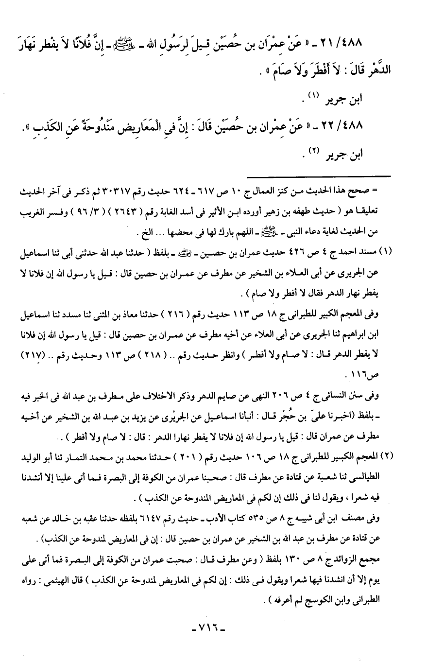 488/ 21 - "عَنْ عِمْرَان بن حُصَيْن قِيلَ لِرَسُولِ الله - صلى الله عليه وسلم - إِنَّ فُلانًا لَا يفْطر نَهَارَ الدَّهْر قَالَ: لَا أفْطَرَ وَلَا صَامَ".