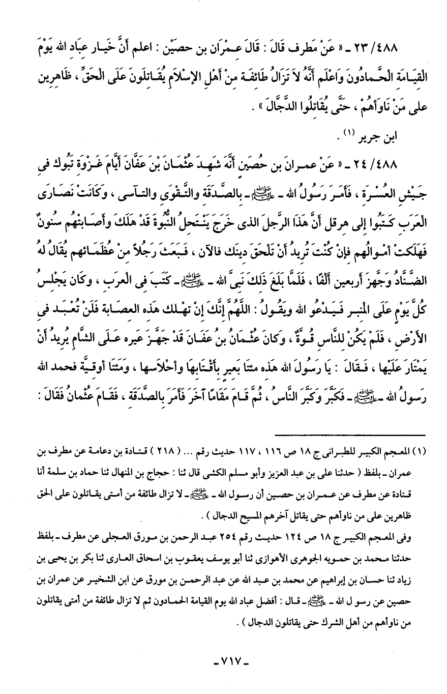 488/ 23 - "عَنْ مَطرف قَالَ: قَالَ عِمْرَان بن حصَيْن: اعلم أَنَّ خَيار عِبَادِ الله يَوْمَ الْقِيَامَةِ الْحمَّادُونَ وَاعْلَم أَنَّهُ لَا تَزَالُ طَائِفَة مِنْ أَهْلِ الإسْلَامِ يُقَاتِلَونَ عَلَى الْحَقِّ، ظَاهِرِين على مَنْ نَاوَأهُمْ، حَتَّى يُقَاتِلُوا الدَّجَّالَ".
