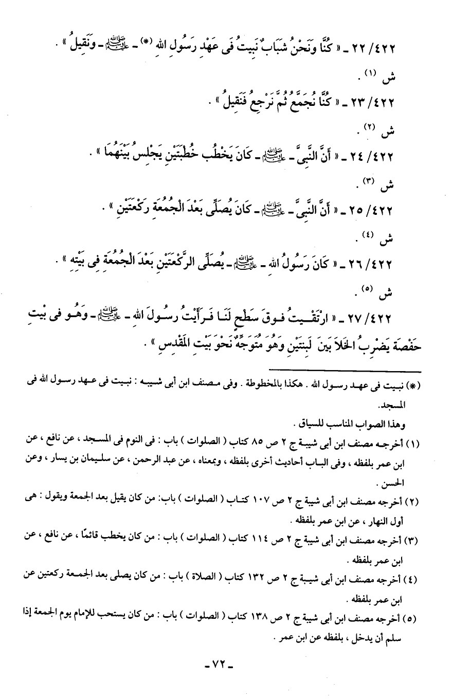 422/ 26 - "كَانَ رَسُولُ اللهِ - صلى الله عليه وسلم - يُصَلِّى الرَّكْعَتَيْنِ بَعْدَ الْجُمُعَةِ فِى بَيْتِهِ".