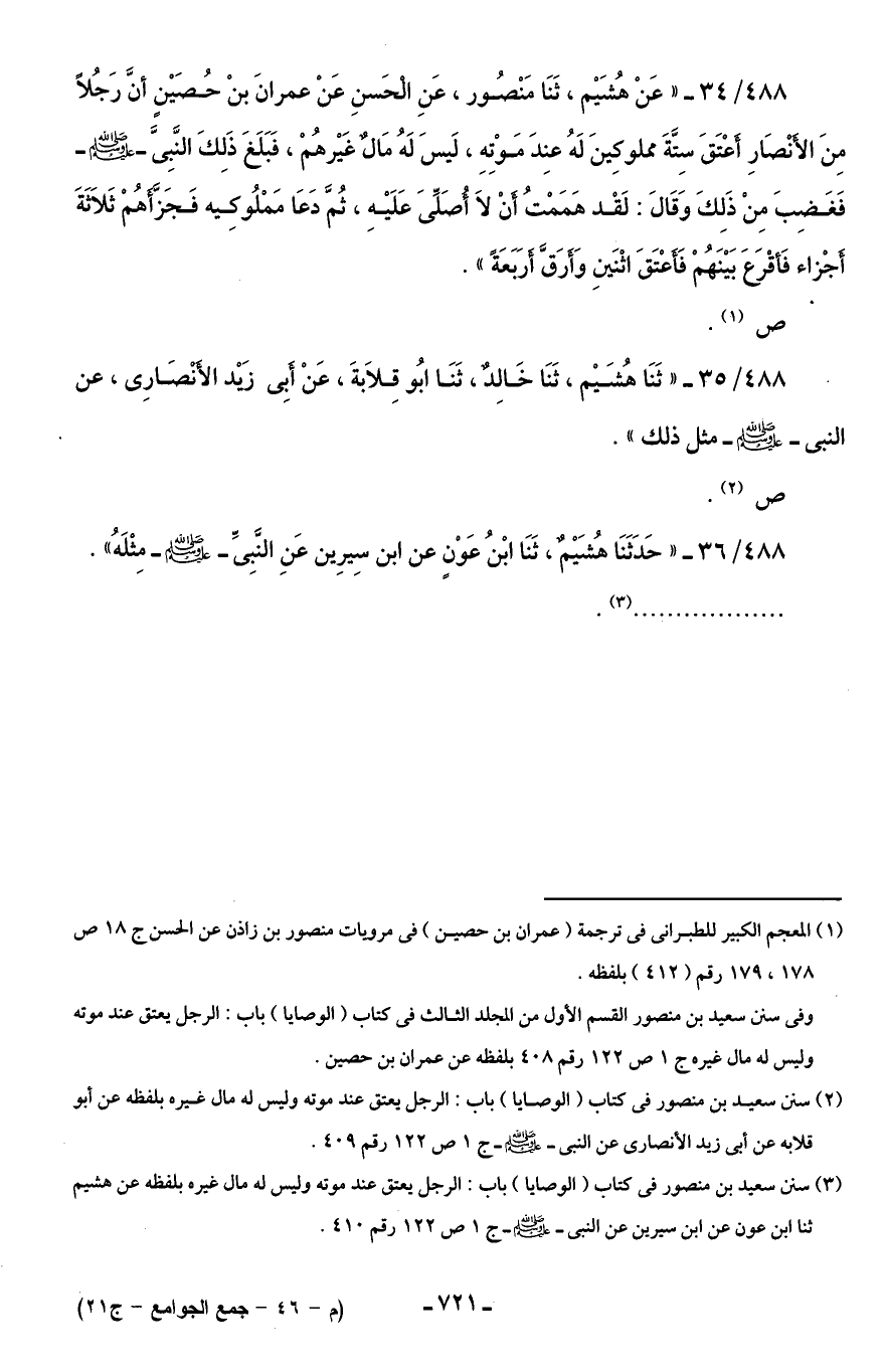 488/ 34 - "عَنْ هُشَيْم، ثَنَا مَنْصُور، عَنِ الْحَسنِ عَنْ عمرانَ بنْ حُصَيْنٍ أنَّ رَجُلًا مِنَ الأَنْصَارِ أَعْتَقَ سِتَّةَ مملوكِينَ لَهُ عنِدَ مَوْتِهِ، لَيسَ لَهُ مَالٌ غَيْرهُمْ، فَبَلَغَ ذَلِكَ النَّبِىَّ - صلى الله عليه وسلم - فَغَضِبَ مِنْ ذَلِكَ وَقَالَ: لَقْد هَمَمْتُ أَنْ لَا أُصَلِّى عَلَيْهِ، ثُمَّ دَعَا مَمْلُوكِيه فَجَزَّأَهُمْ ثَلَاثَةَ أَجْزاء فَأقْرَعَ بَيْنَهُمْ فَأَعْتَقَ اثْنَينِ وَأَرَقَّ أَربَعَةً".