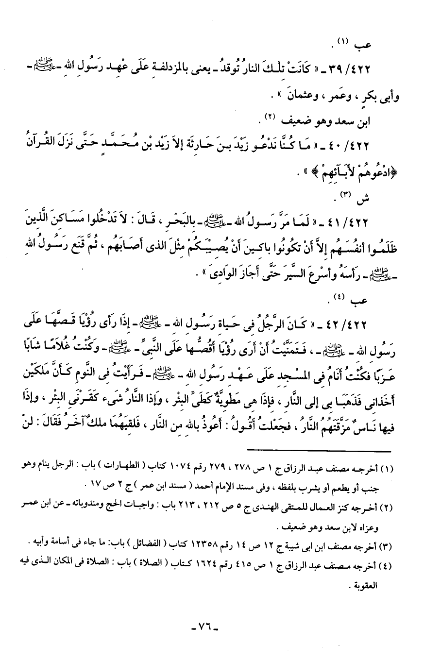422/ 39 - "كَانَتْ تِلْكَ النارُ تُوقدُ - يعنى بالمزدلفةِ عَلَى عْهِد رَسُولِ اللهِ - صلى الله عليه وسلم - وأبى بكر، وعَمر، وعثمانَ".
