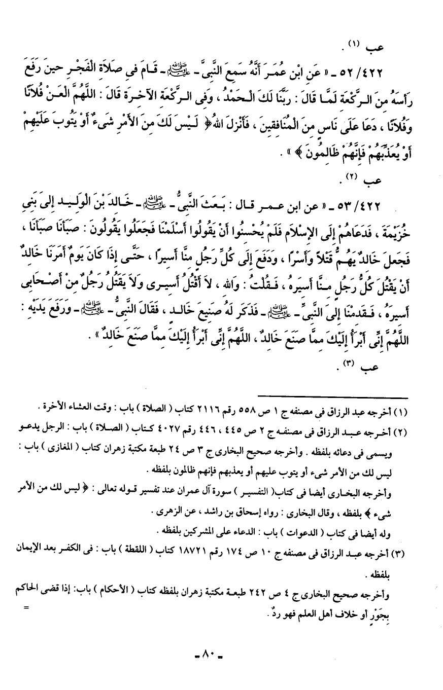 422/ 52 - "عَنِ ابْن عُمَرَ أَنَّهُ سَمِعَ النَّبِىَّ - صلى الله عليه وسلم - قَامَ في صَلاَةِ الْفَجْرِ حينَ رَفَعَ رَأسَهُ مِنَ الرَّكْعَةِ لَمَّا قَالَ: رَبَّنَا لَكَ الْحَمْدُ، وَفِى الرَّكْعَةِ الآخِرَة قَالَ: اللَّهُمَّ الْعَنْ فُلاَنًا وَفُلاَنًا، دَعَا عَلَى نَاسٍ مِنَ الْمُنَافِقيِنَ، فَأَنْزلَ الله {لَيْسَ لَكَ مِنَ الْأَمْرِ شَيْءٌ أَوْ يَتُوبَ عَلَيْهِمْ أَوْ يُعَذِّبَهُمْ فَإِنَّهُمْ ظَالِمُونَ} ".