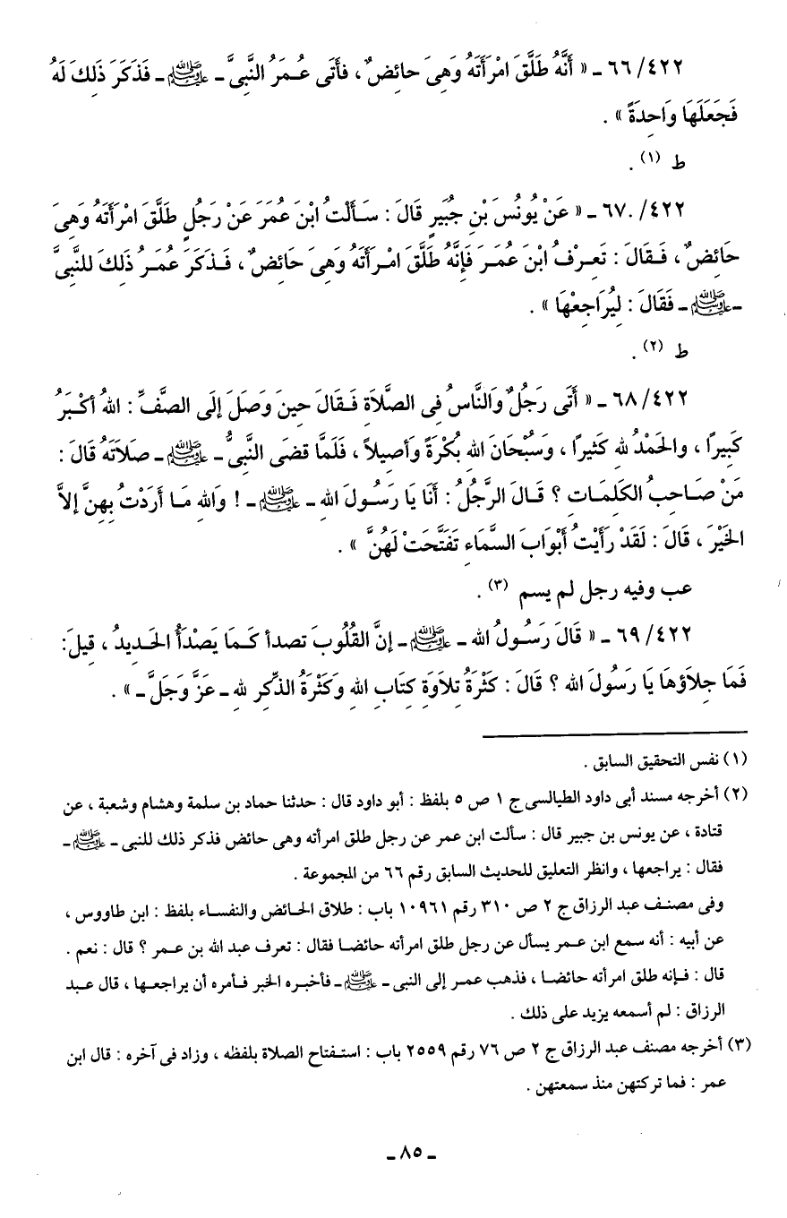 422/ 67 - "عَنْ يُونُسَ بْنِ جُبَيرٍ قَالَ: سَأَلْتُ ابْنَ عُمَرَ عَنْ رَجُلٍ طَلَّقَ امْرَأَتَهُ وَهِىَ حَائِضٌ، فَقَالَ: تَعِرْفُ ابْنَ عُمَرَ فَإِنَّهُ طَلَّقَ امْرَأَتَهُ وَهِىَ حَائِضٌ، فَذَكَرَ عُمَرُ ذَلِكَ للنَّبِىَّ - صلى الله عليه وسلم - فَقَالَ: لِيُرَاجِعْهَا".