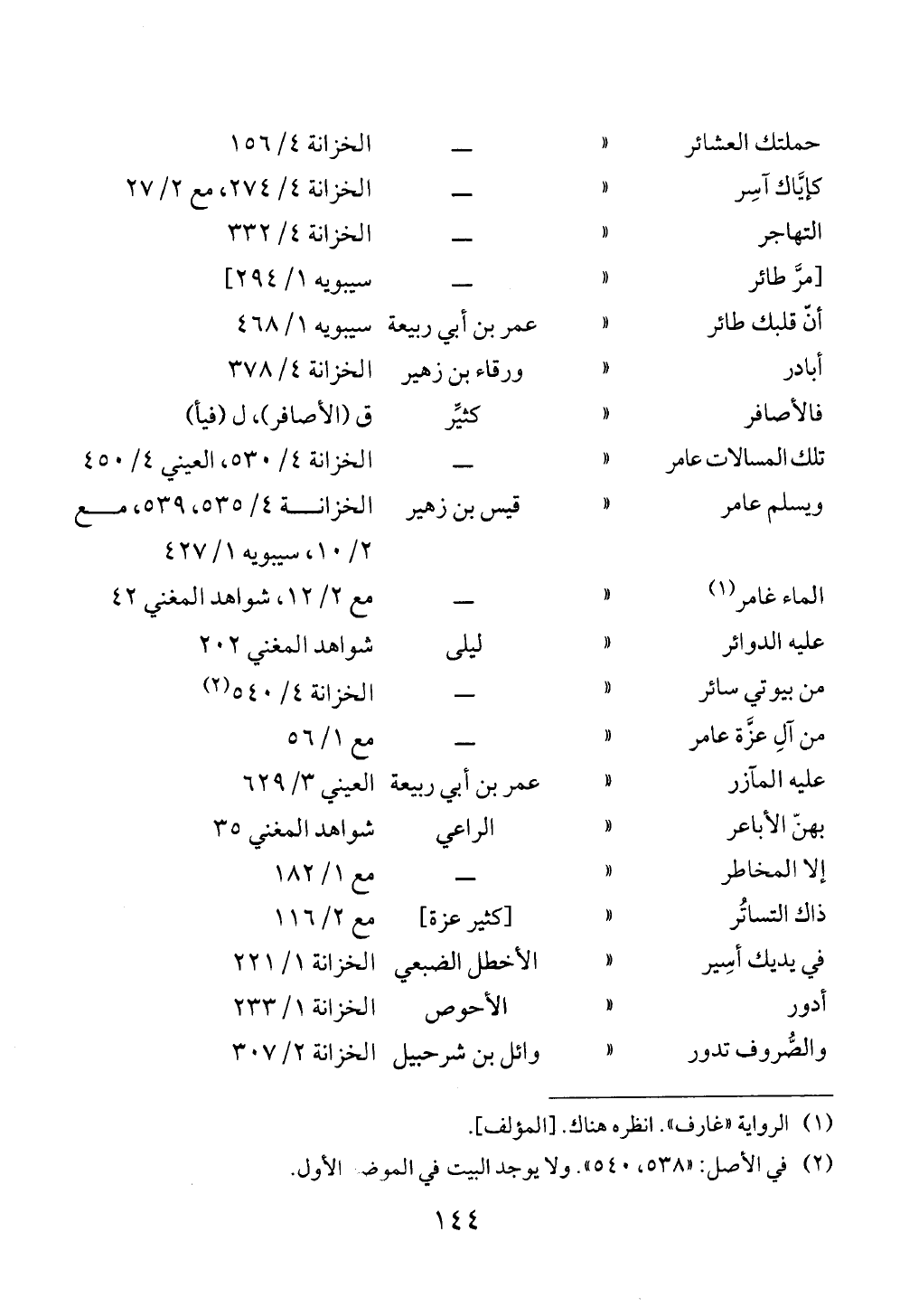 حملتك العشائر « ــ الخزانة ٤/ ١٥٦كإيَّاك آسِر « ــ الخزانة ٤/ ٢٧٤، مع ٢/ ٢٧التهاجر « ــ الخزانة ٤/ ٣٣٢[مرَّ طائر « ــ سيبويه ١/ ٢٩٤]أنّ قلبك طائر « عمر بن أبي ربيعة سيبويه ١/ ٤٦٨أبادر « ورقاء بن زهير الخزانة ٤/ ٣٧٨فالأصافر « كثيِّر ق (الأصافر)، ل (فيأ)تلك المسالات عامر « ــ الخزانة ٤/ ٥٣٠، العيني ٤/ ٤٥٠ويسلم عامر « قيس بن زهير الخزانة ٤/ ٥٣٥، ٥٣٩، مع ٢/ ١٠، سيبويه ١/ ٤٢٧الماء غامر (¬١) « ــ مع ٢/ ١٢، شواهد المغني ٤٢عليه الدوائر « ليلى شواهد المغني ٢٠٢من بيوتي سائر « ــ الخزانة ٤/ ٥٤٠ (¬٢)من آلِ عزَّة عامر « ــ مع ١/ ٥٦عليه المآزر « عمر بن أبي ربيعة العيني ٣/ ٦٢٩بهنّ الأباعر « الراعي شواهد المغني ٣٥إلا المخاطر « ــ مع ١/ ١٨٢ذاك التساتُر « [كثير عزة] مع ٢/ ١١٦في يديك أسِير « الأخطل الضبعي الخزانة ١/ ٢٢١أدور « الأحوص الخزانة ١/ ٢٣٣والصُّروف تدور « وائل بن شرحبيل الخزانة ٢/ ٣٠٧