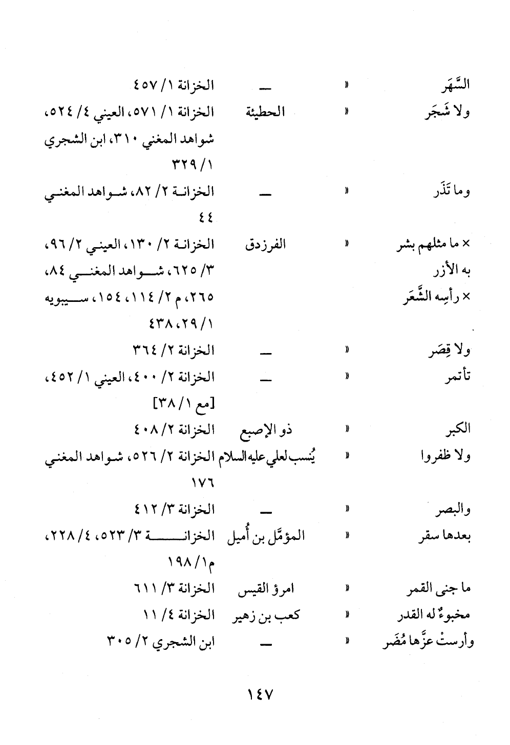 السَّهَر « ــ الخزانة ١/ ٤٥٧ولا شَجَر « الحطيئة الخزانة ١/ ٥٧١، العيني ٤/ ٥٢٤، شواهد المغني ٣١٠، ابن الشجري ١/ ٣٢٩وما تَذَر « ــ الخزانة ٢/ ٨٢، شواهد المغني ٤٤× ما مثلهم بشر به الأزر × رأسِه الشَّعَر « الفرزدق الخزانة ٢/ ١٣٠، العيني ٢/ ٩٦، ٣/ ٦٢٥، شواهد المغني ٨٤، ٢٦٥، م ٢/ ١١٤، ١٥٤، سيبويه ١/ ٢٩، ٤٣٨ ولا قِصَر « ــ الخزانة ٢/ ٣٦٤تأتمر « ــ الخزانة ٢/ ٤٠٠، العيني ١/ ٤٥٢، [مع ١/ ٣٨]الكبر « ذو الإصبع الخزانة ٢/ ٤٠٨ولا ظفروا « يُنسب لعلي عليه السلام الخزانة ٢/ ٥٢٦، شواهد المغني ١٧٦والبصر « ــ الخزانة ٣/ ٤١٢بعدها سقر « المؤمَّل بن أُميل الخزانة ٣/ ٥٢٣، ٤/ ٢٢٨، م ١/ ١٩٨ما جنى القمر « امرؤ القيس الخزانة ٣/ ٦١١مخبوءٌ له القدر « كعب بن زهير الخزانة ٤/ ١١وأرستْ عزَّها مُضَر « ــ ابن الشجري ٢/ ٣٠٥