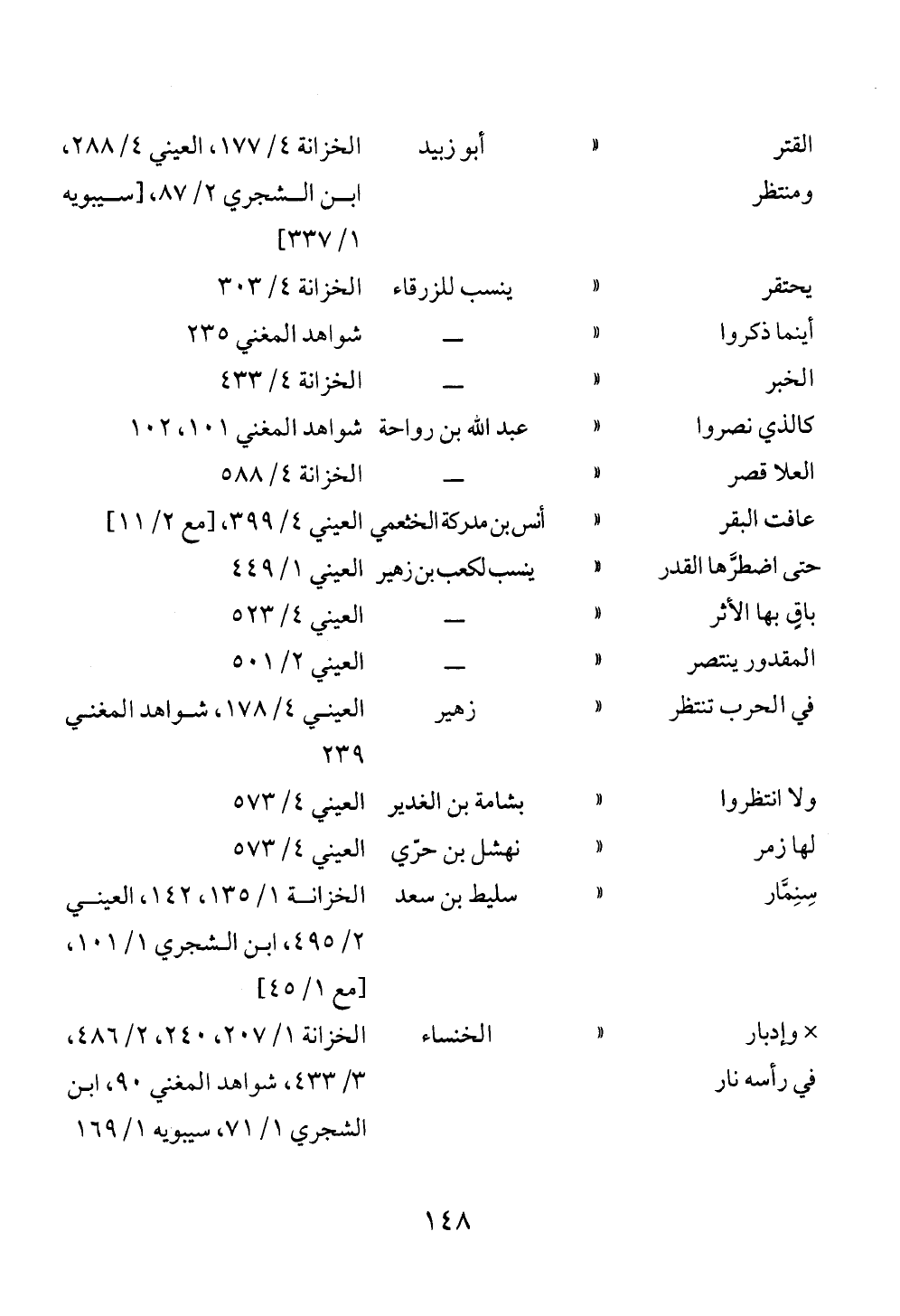 القترومنتظر « أبو زبيد الخزانة ٤/ ١٧٧، العيني ٤/ ٢٨٨، ابن الشجري ٢/ ٨٧، [سيبويه ١/ ٣٣٧] يحتقر « ينسب للزرقاء الخزانة ٤/ ٣٠٣أينما ذكروا « ــ شواهد المغني ٢٣٥الخبر « ــ الخزانة ٤/ ٤٣٣كالذي نصروا « عبد الله بن رواحة شواهد المغني ١٠١، ١٠٢العلا قصر « ــ الخزانة ٤/ ٥٨٨عافت البقر « أنس بن مدركة الخثعمي العيني ٤/ ٣٩٩، [مع ٢/ ١١]حتى اضطرَّها القدر « ينسب لكعب بن زهير العيني ١/ ٤٤٩باقٍ بها الأثر « ــ العيني ٤/ ٥٢٣المقدور ينتصر « ــ العيني ٢/ ٥٠١في الحرب تنتظر « زهير العيني ٤/ ١٧٨، شواهد المغني ٢٣٩ولا انتظروا « بشامة بن الغدير العيني ٤/ ٥٧٣لها زمر « نهشل بن حرّي العيني ٤/ ٥٧٣سِنِمَّار « سليط بن سعد الخزانة ١/ ١٣٥، ١٤٢، العيني ٢/ ٤٩٥، ابن الشجري ١/ ١٠١، [مع ١/ ٤٥]× وإدبارفي رأسه نار « الخنساء الخزانة ١/ ٢٠٧، ٢٤٠، ٢/ ٤٨٦، ٣/ ٤٣٣، شواهد المغني ٩٠، ابن الشجري ١/ ٧١، سيبويه ١/ ١٦٩