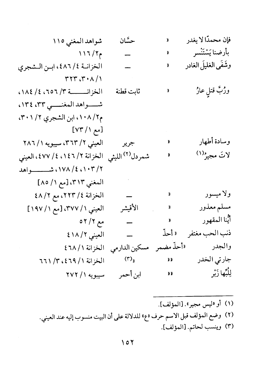 فإن محمدًا لا يغدر « حسَّان شواهد المغني ١١٥بأرضنا يَسْتَنْسر « ــ م ٢/ ١١٦وشَفَى الغليلَ الغادر « ــ الخزانة ٤/ ٤٨٦، ابن الشجري ١/ ٣٠٨، ٣٢٣ورُبَّ قتلٍ عارُ « ثابت قطنة الخزانة ٣/ ٦٥٦، ٤/ ١٨٤، شواهد المغني ٣٣، ١٣٤، م ٢/ ١٠٨، ابن الشجري ٢/ ٣٠١، [مع ١/ ٧٣]وسادة أطهار « جرير العيني ٢/ ٣٦٣، سيبويه ١/ ٢٨٦لاتَ مجيرُ (¬١) « شمردل (¬٢) الليثي الخزانة ٢/ ١٤٦، ٤/ ٤٧٧، العيني ٢/ ١٠٣، ٤/ ١٧٨، شواهد المغني ٣١٣، [مع ١/ ٨٥]ولا ميسور « ــ الخزانة ٤/ ٢٢٣، مع ٢/ ٤٨مسلم معذور « الأقيشر العيني ١/ ٣٧٧، [مع ١/ ١٩٧]أيُّنا المقهور « ــ مع ٢/ ٥٢ذنب الحب مغتفر «أحذّ ــ العيني ٢/ ٤١٨والجدر «أحذّ مضمر مسكين الدارمي الخزانة ١/ ٤٦٨جارتي الخدر «« «(¬٣) الخزانة ١/ ٤٦٩، ٣/ ٦٦١لِلُبِّها زَبْر «« ابن أحمر سيبويه ١/ ٢٧٢
