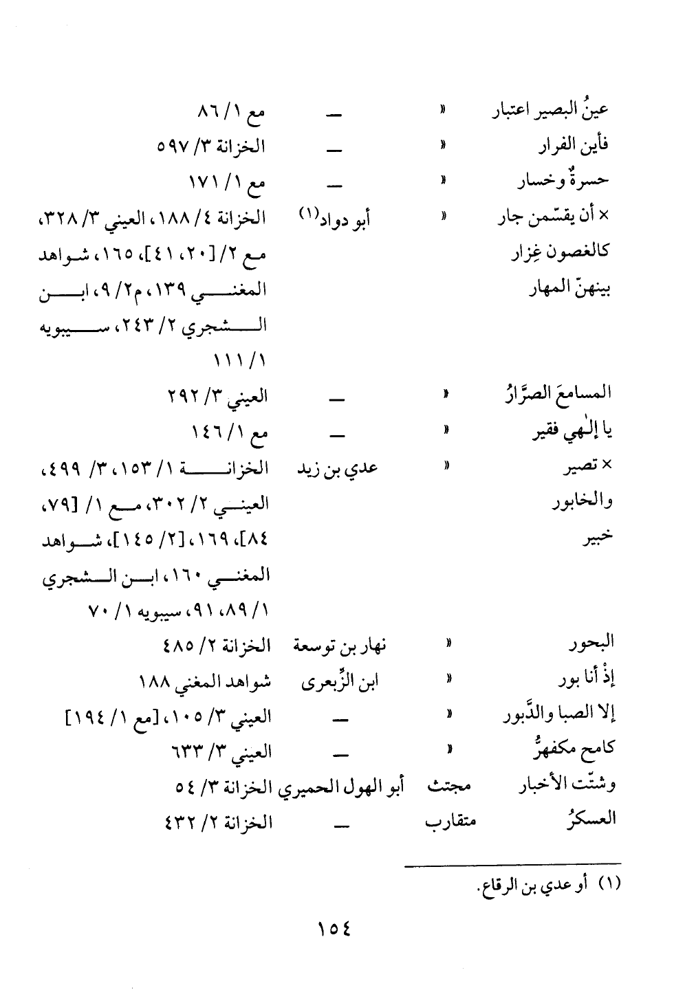 عينُ البصير اعتبار « ــ مع ١/ ٨٦فأين الفرار « ــ الخزانة ٣/ ٥٩٧حسرةٌ وخسار « ــ مع ١/ ١٧١× أن يقسّمن جار كالغصون غِزار بينهنّ المهار « أبو دواد (¬١) الخزانة ٤/ ١٨٨، العيني ٣/ ٣٢٨، مع ٢/ [٢٠، ٤١]، ١٦٥، شواهد المغني ١٣٩، م ٢/ ٩، ابن الشجري ٢/ ٢٤٣، سيبويه ١/ ١١١ المسامعَ الصرَّارُ « ــ العيني ٣/ ٢٩٢يا إلاهي فقير « ــ مع ١/ ١٤٦× تصير والخابور خبير « عدي بن زيد الخزانة ١/ ١٥٣، ٣/ ٤٩٩، العيني ٢/ ٣٠٢، مع ١/ [٧٩، ٨٤]، ١٦٩، [٢/ ١٤٥]، شواهد المغني ١٦٠، ابن الشجري ١/ ٨٩، ٩١، سيبويه ١/ ٧٠ البحور « نهار بن توسعة الخزانة ٢/ ٤٨٥إذْ أنا بور « ابن الزِّبعرى شواهد المغني ١٨٨إلا الصبا والدَّبور « ــ العيني ٣/ ١٠٥، [مع ١/ ١٩٤]كامح مكفهرُّ « ــ العيني ٣/ ٦٣٣وشتّت الأخبار مجتث أبو الهول الحميري الخزانة ٣/ ٥٤العسكرُ متقارب ــ الخزانة ٢/ ٤٣٢
