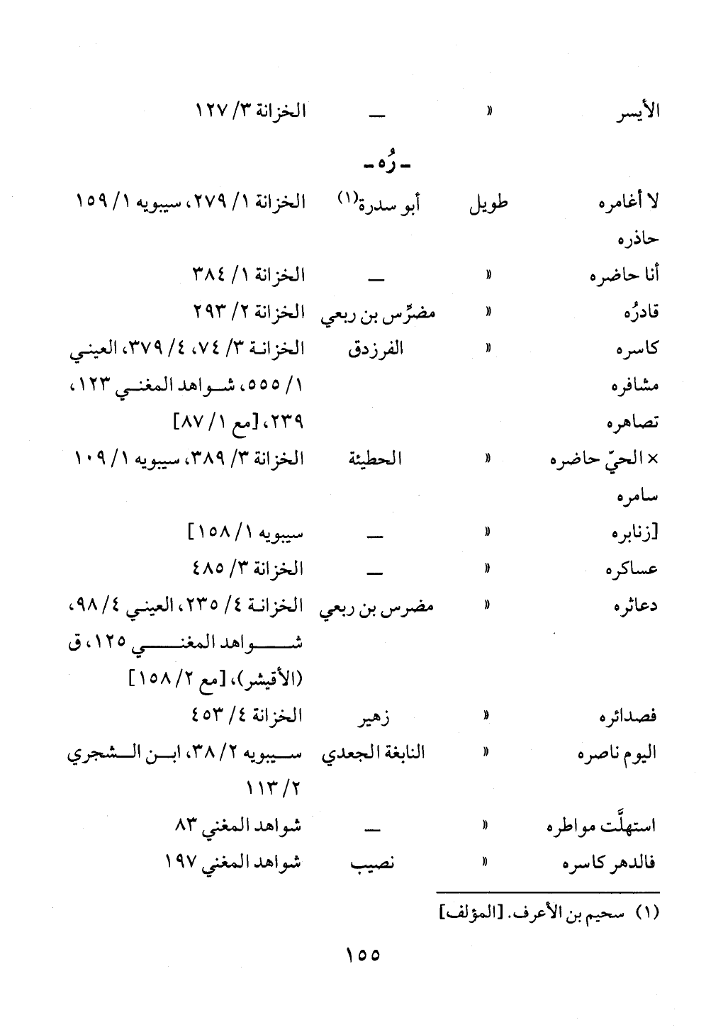 لا أغامره حاذره طويل أبو سدرة (¬١) الخزانة ١/ ٢٧٩، سيبويه ١/ ١٥٩ أنا حاضره « ــ الخزانة ١/ ٣٨٤قادرُه « مضرِّس بن ربعي الخزانة ٢/ ٢٩٣كاسره مشافره تصاهره « الفرزدق الخزانة ٣/ ٧٤، ٤/ ٣٧٩، العيني ١/ ٥٥٥، شواهد المغني ١٢٣، ٢٣٩، [مع ١/ ٨٧]× الحيّ حاضره سامره « الحطيئة الخزانة ٣/ ٣٨٩، سيبويه ١/ ١٠٩ [زنابره « ــ سيبويه ١/ ١٥٨]عساكره « ــ الخزانة ٣/ ٤٨٥دعاثره « مضرس بن ربعي الخزانة ٤/ ٢٣٥، العيني ٤/ ٩٨، شواهد المغني ١٢٥، ق (الأقيشر)، [مع ٢/ ١٥٨]فصدائره « زهير الخزانة ٤/ ٤٥٣اليوم ناصره « النابغة الجعدي سيبويه ٢/ ٣٨، ابن الشجري ٢/ ١١٣استهلَّت مواطره « ــ شواهد المغني ٨٣فالدهر كاسره « نصيب شواهد المغني ١٩٧