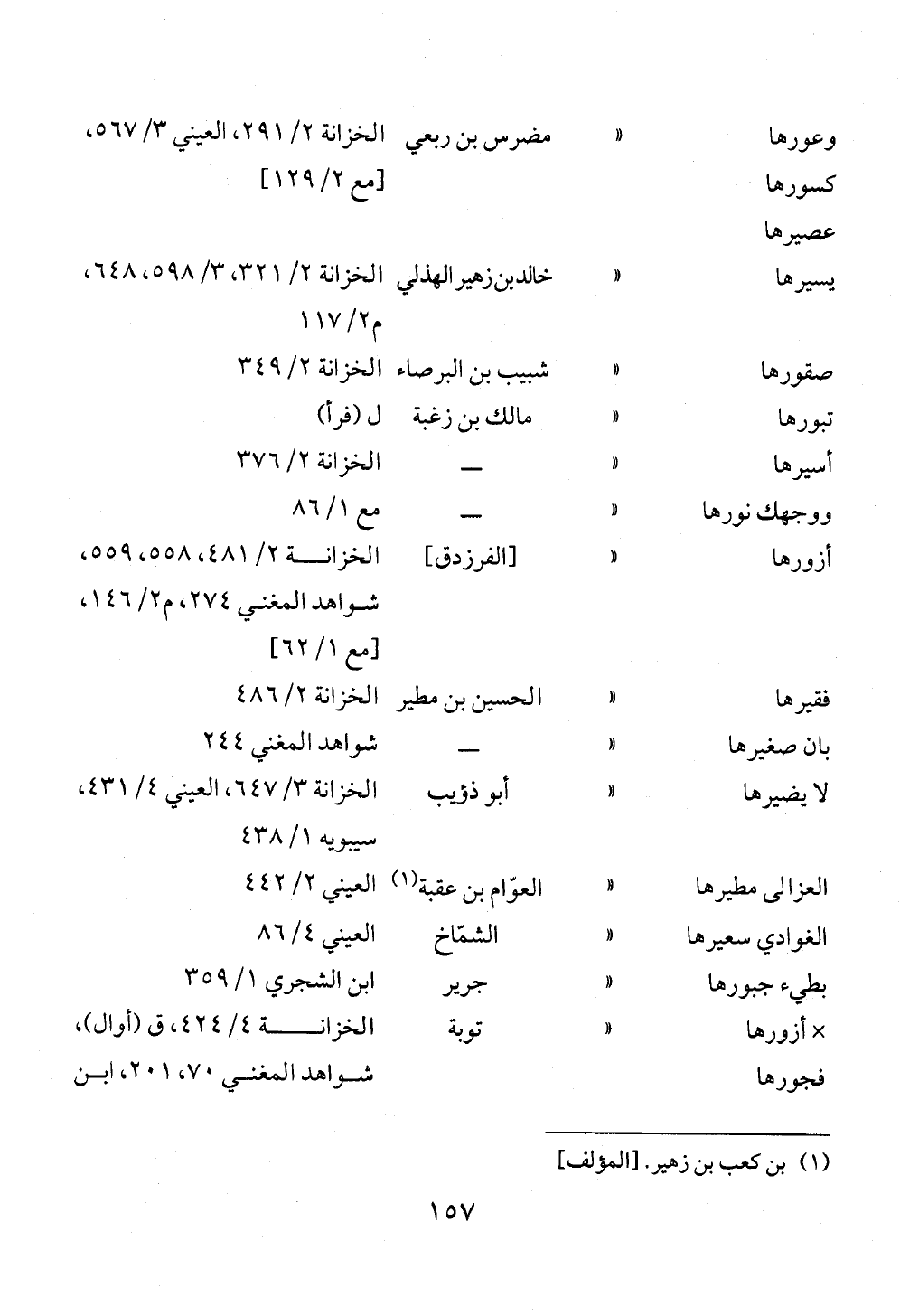 وعورها كسورها عصيرها « مضرس بن ربعي الخزانة ٢/ ٢٩١، العيني ٣/ ٥٦٧، [مع ٢/ ١٢٩]يسيرها « خالد بن زهير الهذلي الخزانة ٢/ ٣٢١، ٣/ ٥٩٨، ٦٤٨، م ٢/ ١١٧صقورها « شبيب بن البرصاء الخزانة ٢/ ٣٤٩تبورها « مالك بن زغبة ل (فرأ)أسيرها « ــ الخزانة ٢/ ٣٧٦ووجهك نورها « ــ مع ١/ ٨٦أزورها « [الفرزدق] الخزانة ٢/ ٤٨١، ٥٥٨، ٥٥٩، شواهد المغني ٢٧٤، م ٢/ ١٤٦، [مع ١/ ٦٢]فقيرها « الحسين بن مطير الخزانة ٢/ ٤٨٦بان صغيرها « ــ شواهد المغني ٢٤٤لا يضيرها « أبو ذؤيب الخزانة ٣/ ٦٤٧، العيني ٤/ ٤٣١، سيبويه ١/ ٤٣٨العزالى مطيرها « العوّام بن عقبة (¬١) العيني ٢/ ٤٤٢الغوادي سعيرها « الشمّاخ العيني ٤/ ٨٦بطيء جبورها « جرير ابن الشجري ١/ ٣٥٩× أزورها فجورها « توبة الخزانة ٤/ ٤٢٤، ق (أوال)، شواهد المغني ٧٠، ٢٠١، ابن الشجري ٢/ ٣١٧، سيبويه ١/ ٣١٢، [مع ٢/ ١٨١]