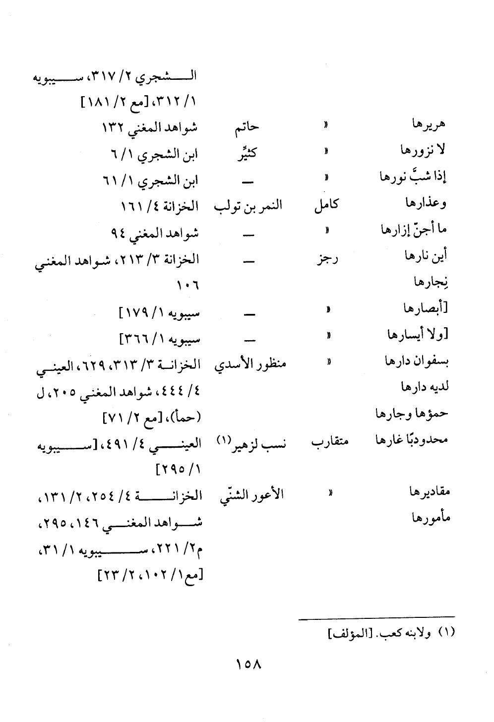 هريرها « حاتم شواهد المغني ١٣٢لا نزورها « كثيِّر ابن الشجري ١/ ٦إذا شبَّ نورها « ــ ابن الشجري ١/ ٦١وعذارها كامل النمر بن تولب الخزانة ٤/ ١٦١ما أجنّ إزارها « ــ شواهد المغني ٩٤أين نارها نِجارها رجز ــ الخزانة ٣/ ٢١٣، شواهد المغني ١٠٦ [أبصارها « ــ سيبويه ١/ ١٧٩][ولا أيسارها « ــ سيبويه ١/ ٣٦٦]بسفوان دارها لديه دارها حمؤها وجارها « منظور الأسدي الخزانة ٣/ ٣١٣، ٦٢٩، العيني ٤/ ٤٤٤، شواهد المغني ٢٠٥، ل (حمأ)، [مع ٢/ ٧١] محدودبًا غارها متقارب نسب لزهير (¬١) العيني ٤/ ٤٩١، [سيبويه ١/ ٢٩٥]مقاديرها مأمورها « الأعور الشنّي الخزانة ٤/ ٢٥٤، ٢/ ١٣١، شواهد المغني ١٤٦، ٢٩٥، م ٢/ ٢٢١، سيبويه ١/ ٣١، [مع ١/ ١٠٢، ٢/ ٢٣]