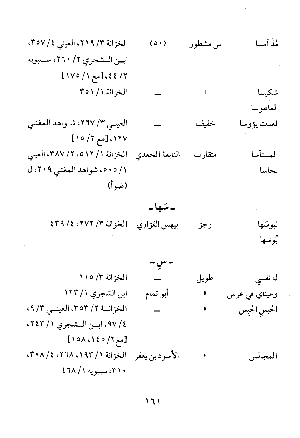 مُذْ أمسا س مشطور (٥٠) الخزانة ٣/ ٢١٩، العيني ٤/ ٣٥٧، ابن الشجري ٢/ ٢٦٠، سيبويه ٢/ ٤٤، [مع ١/ ١٧٥]شكيسا العاطوسا « ــ الخزانة ١/ ٣٥١ فعدت يؤوسا خفيف ــ العيني ٣/ ٢٦٧، شواهد المغني ١٢٧، [مع ٢/ ١٥]المستآسا نحاسا متقارب النابغة الجعدي الخزانة ١/ ٥١٢، ٢/ ٣٨٧، العيني ١/ ٥٠٥، شواهد المغني ٢٠٩، ل (ضوأ)