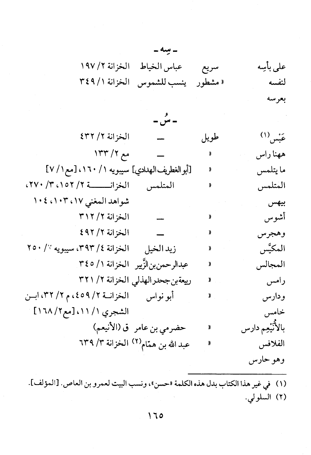 عَبْس (¬١) طويل ــ الخزانة ٢/ ٤٣٢ههنا راس « ــ مع ٢/ ١٣٣ما يتلمس « [أبو الغطريف الهدادي] سيبويه ١/ ١٦٠، [مع ١/ ٧]المتلمسبيهس « المتلمس الخزانة ٢/ ١٥٢، ٣/ ٢٧٠، شواهد المغني ١٧، ١٠٣، ١٠٤ أشوس « ــ الخزانة ٢/ ٣١٢وهجرس « ــ الخزانة ٢/ ٤٩٢المكيَّس « زيد الخيل الخزانة ٤/ ٣٩٣، سيبويه ٢/ ٢٥٠المجالس « عبد الرحمن بن الزَّبير الخزانة ١/ ٣٤٥رامس « ربيعة بن جحدر الهذلي الخزانة ٢/ ٣٢١ودارسخامس « أبو نواس الخزانة ٢/ ٤٥٩، م ٢/ ٣٢، ابن الشجري ١/ ١١، [مع ٢/ ١٦٨] بالأُنَيْعِم دارس « حضرمي بن عامر ق (الأنيعم)الفلافسوهو حارس « عبد الله بن همّام (¬٢) الخزانة ٣/ ٦٣٩