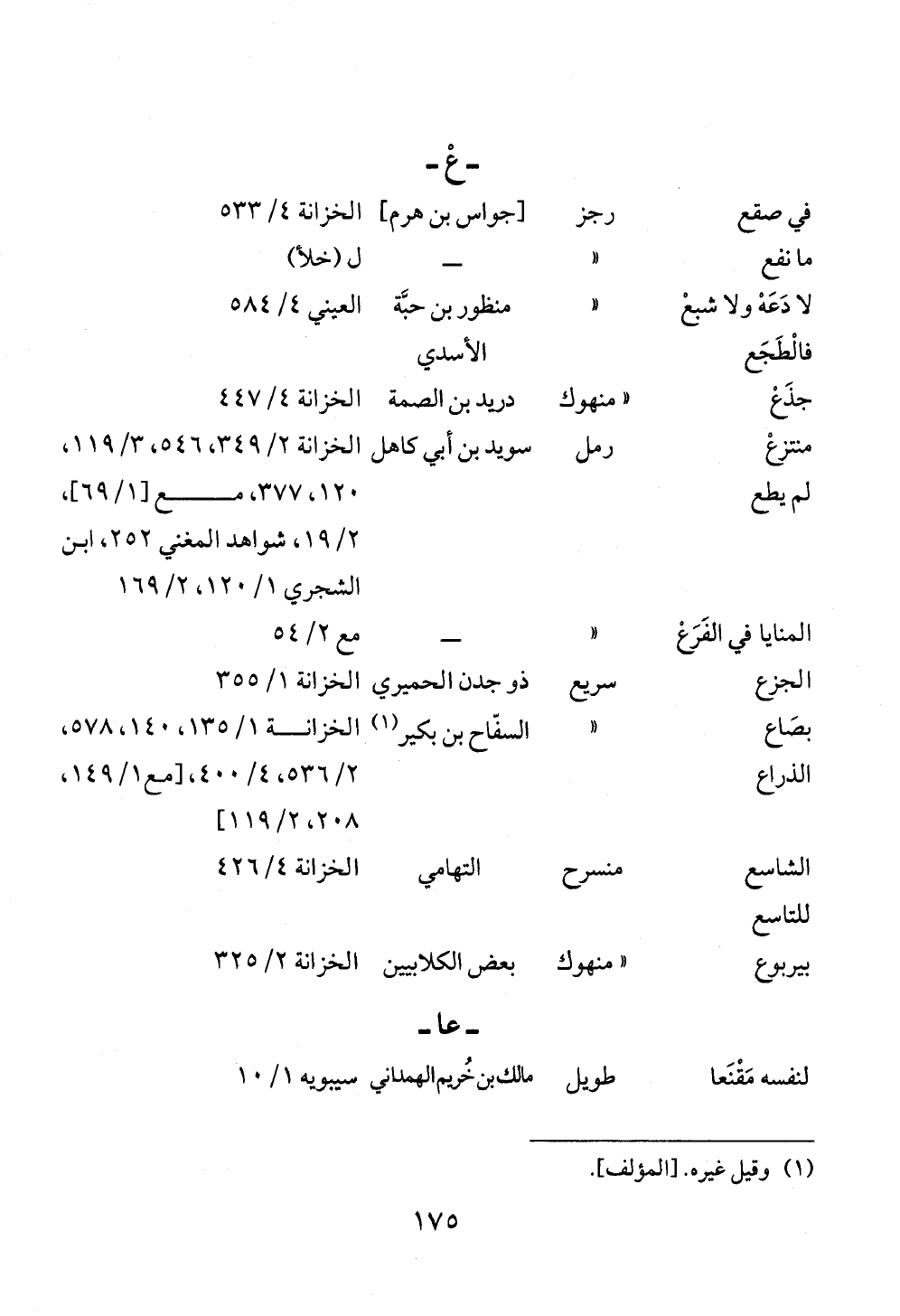 لا دَعَهْ ولا شبعْ فالْطَجَع « منظور بن حبَّة الأسدي العيني ٤/ ٥٨٤ جذَعْ «منهوك دريد بن الصمة الخزانة ٤/ ٤٤٧منتزعْ لم يطع رمل سويد بن أبي كاهل الخزانة ٢/ ٣٤٩، ٥٤٦، ٣/ ١١٩، ١٢٠، ٣٧٧، مع [١/ ٦٩]، ٢/ ١٩، شواهد المغني ٢٥٢، ابن الشجري ١/ ١٢٠، ٢/ ١٦٩المنايا في الفَرَعْ « ــ مع ٢/ ٥٤الجزع سريع ذو جدن الحميري الخزانة ١/ ٣٥٥بصَاع الذراع « السفّاح بن بكير (¬١) الخزانة ١/ ١٣٥، ١٤٠، ٥٧٨، ٢/ ٥٣٦، ٤/ ٤٠٠، [مع ١/ ١٤٩، ٢٠٨، ٢/ ١١٩] الشاسع للتاسع منسرح التهامي الخزانة ٤/ ٤٢٦ بيربوع «منهوك بعض الكلابيين الخزانة ٢/ ٣٢٥