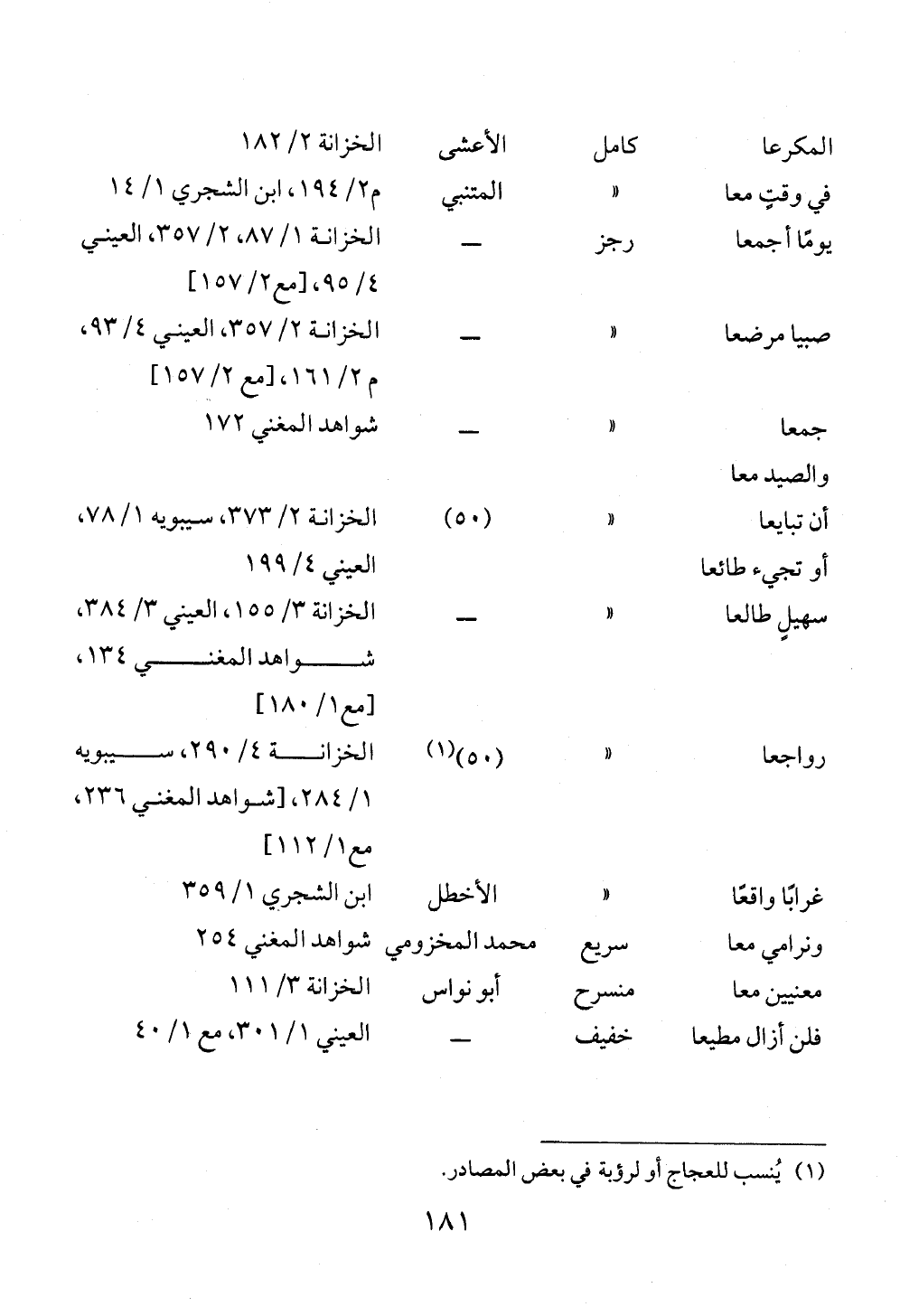 المكرعا كامل الأعشى الخزانة ٢/ ١٨٢في وقتٍ معا « المتنبي م ٢/ ١٩٤، ابن الشجري ١/ ١٤يومًا أجمعا رجز ــ الخزانة ١/ ٨٧، ٢/ ٣٥٧، العيني ٤/ ٩٥، [مع ٢/ ١٥٧]صبيا مرضعا « ــ الخزانة ٢/ ٣٥٧، العيني ٤/ ٩٣، م ٢/ ١٦١، [مع ٢/ ١٥٧]جمعا والصيد معا « ــ شواهد المغني ١٧٢ أن تبايعاأو تجيء طائعا « (٥٠) الخزانة ٢/ ٣٧٣، سيبويه ١/ ٧٨، العيني ٤/ ١٩٩ سهيلٍ طالعا « ــ الخزانة ٣/ ١٥٥، العيني ٣/ ٣٨٤، شواهد المغني ١٣٤، [مع ١/ ١٨٠]رواجعا « (٥٠) (¬١) الخزانة ٤/ ٢٩٠، سيبويه ١/ ٢٨٤، [شواهد المغني ٢٣٦، مع ١/ ١١٢]غرابًا واقعًا « الأخطل ابن الشجري ١/ ٣٥٩ونرامي معا سريع محمد المخزومي شواهد المغني ٢٥٤معنيين معا منسرح أبو نواس الخزانة ٣/ ١١١فلن أزال مطيعا خفيف ــ العيني ١/ ٣٠١، مع ١/ ٤٠