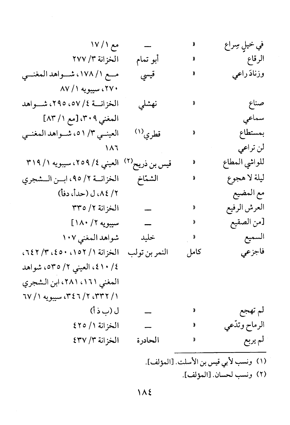 في خيلٍ سِراع « ــ مع ١/ ١٧الرقاع « أبو تمام الخزانة ٣/ ٢٧٧وزنادَ راعي « قيسي مع ١/ ١٧٨، شواهد المغني ٢٧٠، سيبويه ١/ ٨٧صناع سماعي « نهشلي الخزانة ٤/ ٥٧، ٢٩٥، شواهد المغني ٣٠٩، [مع ١/ ٨٣] بمستطاع لن تراعي « قطري (¬١) العيني ٣/ ٥١، شواهد المغني ١٨٦ للواشي المطاع « قيس بن ذريح (¬٢) العيني ٤/ ٢٥٩، سيبويه ١/ ٣١٩ليلة لا هجوع مع المضيع « الشمّاخ الخزانة ٢/ ٩٥، ابن الشجري ٢/ ٨٤، ل (حدأ، دفأ) العرش الرفيع « ــ الخزانة ٢/ ٣٣٥[من الصقيع « ــ سيبويه ٢/ ١٨٠]السميع « خليد شواهد المغني ١٠٧فاجزعي كامل النمر بن تولب الخزانة ١/ ١٥٢، ٤٥٠، ٣/ ٦٤٢، ٤/ ٤١٠، العيني ٢/ ٥٣٥، شواهد المغني ١٦١، ٢٨١، ابن الشجري ١/ ٣٣٢، ٢/ ٣٤٦، سيبويه ١/ ٦٧لم تهجع « ــ ل (ب ذ أ)الرماح وتدّعي « ــ الخزانة ١/ ٤٢٥لم يربع « الحادرة الخزانة ٣/ ٤٣٧