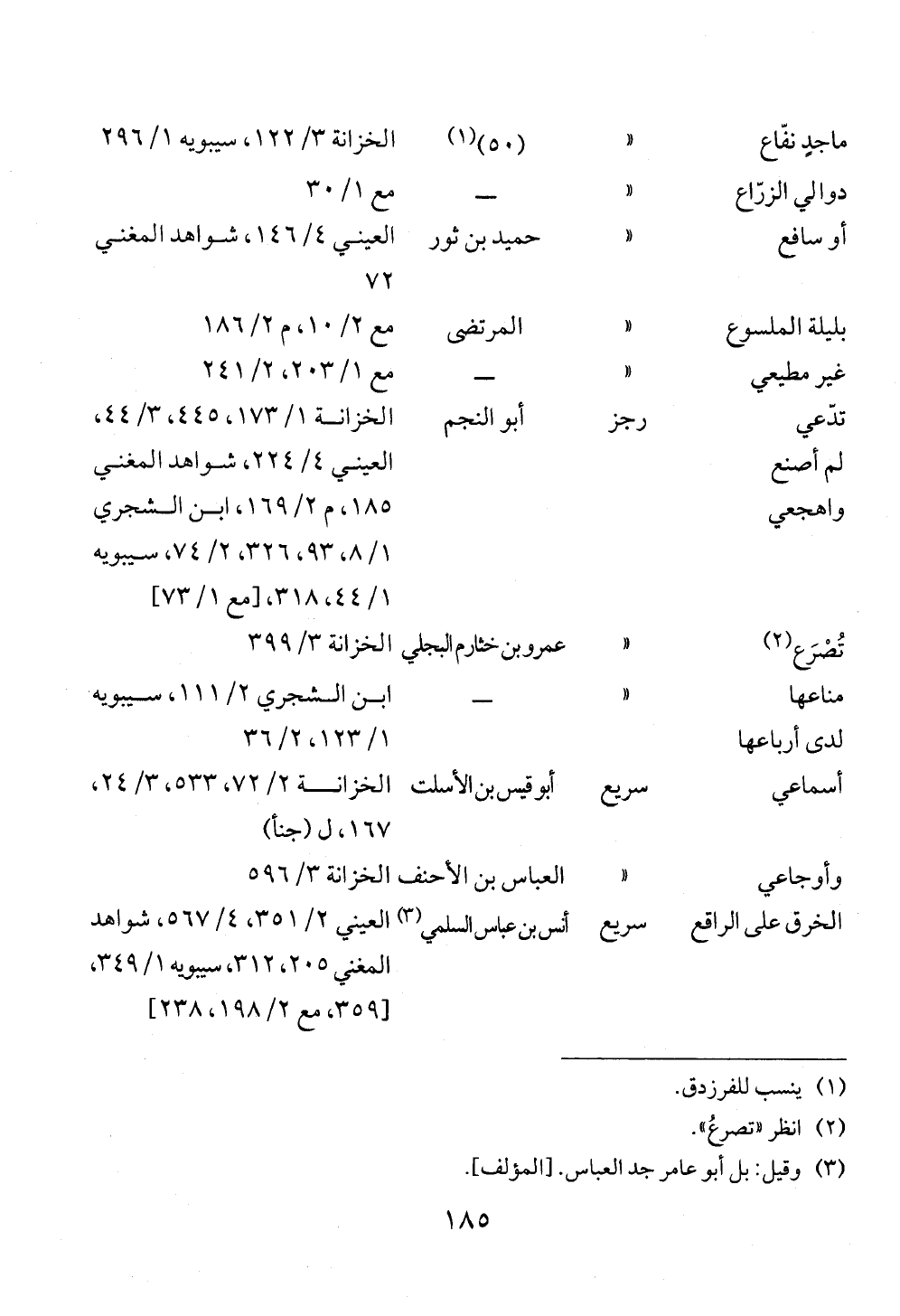 ماجدٍ نفّاع « (٥٠) (¬١) الخزانة ٣/ ١٢٢، سيبويه ١/ ٢٩٦دوالي الزرّاع « ــ مع ١/ ٣٠أو سافع « حميد بن ثور العيني ٤/ ١٤٦، شواهد المغني ٧٢بليلة الملسوع « المرتضى مع ٢/ ١٠، م ٢/ ١٨٦غير مطيعي « ــ مع ١/ ٢٠٣، ٢/ ٢٤١تدّعي لم أصنع واهجعي رجز أبو النجم الخزانة ١/ ١٧٣، ٤٤٥، ٣/ ٤٤، العيني ٤/ ٢٢٤، شواهد المغني ١٨٥، م ٢/ ١٦٩، ابن الشجري ١/ ٨، ٩٣، ٣٢٦، ٢/ ٧٤، سيبويه ١/ ٤٤، ٣١٨، [مع ١/ ٧٣]تُصْرَع (¬٢) « عمرو بن خثارم البجلي الخزانة ٣/ ٣٩٩مناعها لدى أرباعها « ــ ابن الشجري ٢/ ١١١، سيبويه ١/ ١٢٣، ٢/ ٣٦ أسماعي سريع أبو قيس بن الأسلت الخزانة ٢/ ٧٢، ٥٣٣، ٣/ ٢٤، ١٦٧، ل (جنأ)وأوجاعي « العباس بن الأحنف الخزانة ٣/ ٥٩٦الخرق على الراقع سريع أنس بن عباس السلمي (¬٣) العيني ٢/ ٣٥١، ٤/ ٥٦٧، شواهد المغني ٢٠٥، ٣١٢، سيبويه ١/ ٣٤٩، [٣٥٩، مع ٢/ ١٩٨، ٢٣٨]