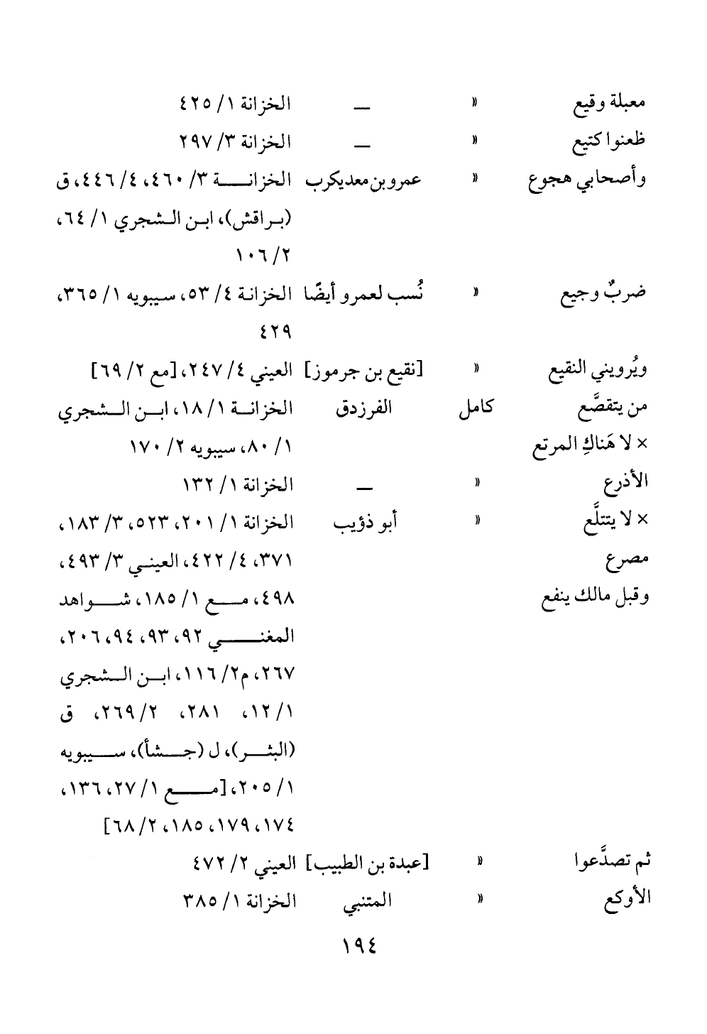 معبلة وقيع « ــ الخزانة ١/ ٤٢٥ظعنوا كتيع « ــ الخزانة ٣/ ٢٩٧وأصحابي هجوع « عمرو بن معد يكرب الخزانة ٣/ ٤٦٠، ٤/ ٤٤٦، ق (براقش)، ابن الشجري ١/ ٦٤، ٢/ ١٠٦ضربٌ وجيع « نُسب لعمرو أيضًا الخزانة ٤/ ٥٣، سيبويه ١/ ٣٦٥، ٤٢٩ويُرويني النقيع « [نقيع بن جرموز] العيني ٤/ ٢٤٧، [مع ٢/ ٦٩]من يتقصَّع × لا هَناكِ المرتع كامل الفرزدق الخزانة ١/ ١٨، ابن الشجري ١/ ٨٠، سيبويه ٢/ ١٧٠ الأذرع « ــ الخزانة ١/ ١٣٢× لا يتتلَّع مصرع وقبل مالك ينفع « أبو ذؤيب الخزانة ١/ ٢٠١، ٥٢٣، ٣/ ١٨٣، ٣٧١، ٤/ ٤٢٢، العيني ٣/ ٤٩٣، ٤٩٨، مع ١/ ١٨٥، شواهد المغني ٩٢، ٩٣، ٩٤، ٢٠٦، ٢٦٧، م ٢/ ١١٦، ابن الشجري ١/ ١٢، ٢٨١، ٢/ ٢٦٩، ق (البثر)، ل (جشأ)، سيبويه ١/ ٢٠٥، [مع ١/ ٢٧، ١٣٦، ١٧٤، ١٧٩، ١٨٥، ٢/ ٦٨] ثم تصدَّعوا « [عبدة بن الطبيب] العيني ٢/ ٤٧٢الأوكع « المتنبي الخزانة ١/ ٣٨٥