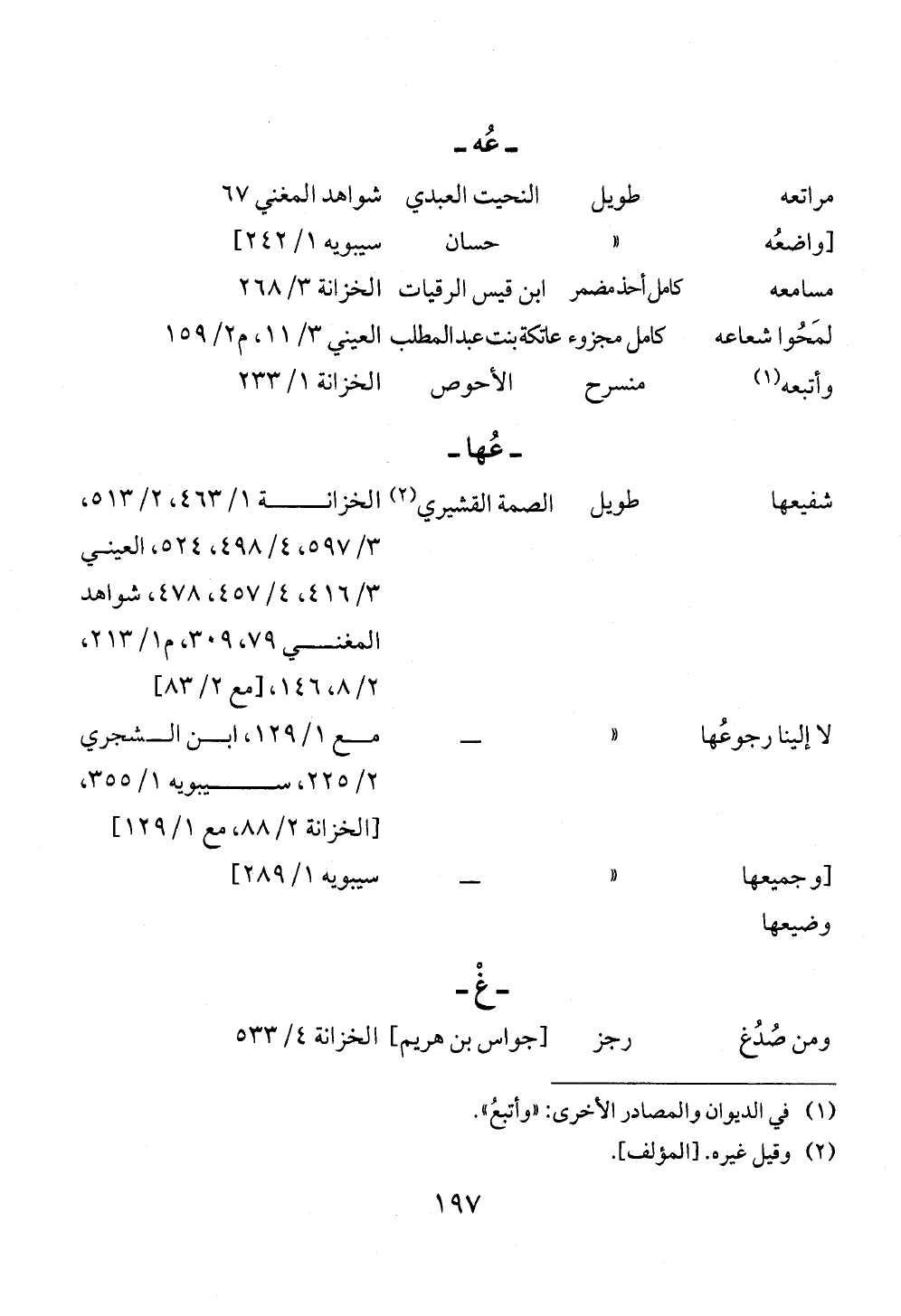 مراتعه طويل النحيت العبدي شواهد المغني ٦٧[واضعُه « حسان سيبويه ١/ ٢٤٢]مسامعه كامل أحذ مضمر ابن قيس الرقيات الخزانة ٣/ ٢٦٨لَمَحُوا شعاعه كامل مجزوء عاتكة بنت عبد المطلب العيني ٣/ ١١، م ٢/ ١٥٩وأتبعه (¬١) منسرح الأحوص الخزانة ١/ ٢٣٣