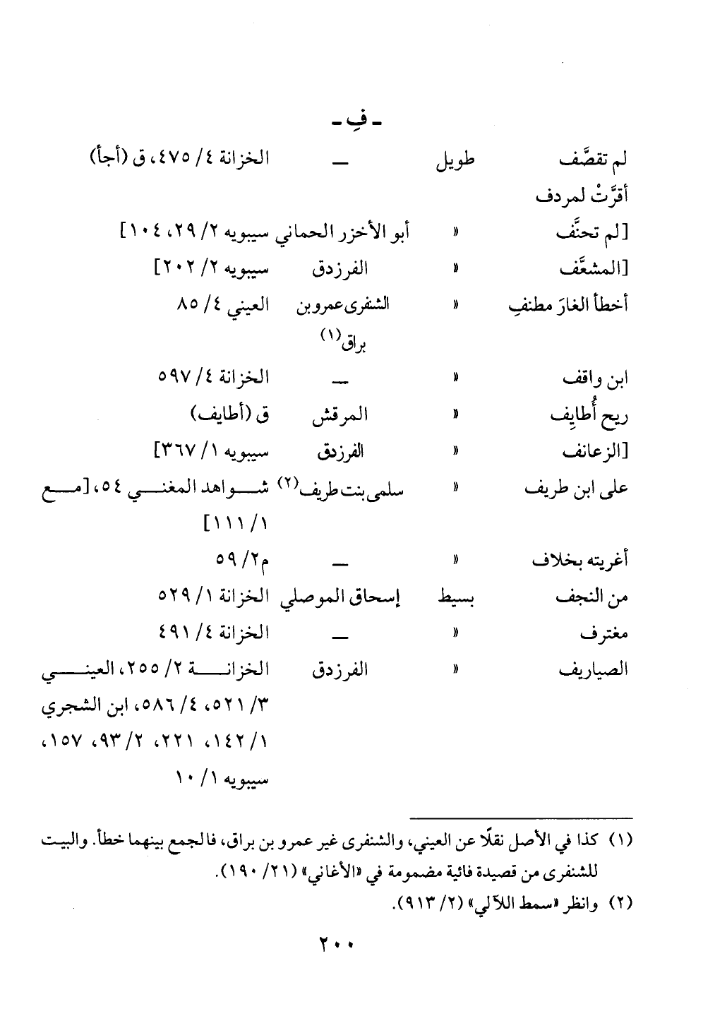 لم تقصَّف أقرَّتْ لمردف طويل ــ الخزانة ٤/ ٤٧٥، ق (أجأ) [لم تحنَّف « أبو الأخزر الحماني سيبويه ٢/ ٢٩، ١٠٤][المشعَّف « الفرزدق سيبويه ٢/ ٢٠٢]أخطأ الغارَ مطنفِ « الشنفرى عمرو بن براق (¬١) العيني ٤/ ٨٥ابن واقف « ــ الخزانة ٤/ ٥٩٧ريح أُطايِف « المرقش ق (أطايف)[الزعانف « الفرزدق سيبويه ١/ ٣٦٧]على ابن طريف « سلمى بنت طريف (¬٢) شواهد المغني ٥٤، [مع ١/ ١١١]أغريته بخلاف « ــ م ٢/ ٥٩من النجف بسيط إسحاق الموصلي الخزانة ١/ ٥٢٩مغترف « ــ الخزانة ٤/ ٤٩١الصياريف « الفرزدق الخزانة ٢/ ٢٥٥، العيني ٣/ ٥٢١، ٤/ ٥٨٦، ابن الشجري ١/ ١٤٢، ٢٢١، ٢/ ٩٣، ١٥٧، سيبويه ١/ ١٠