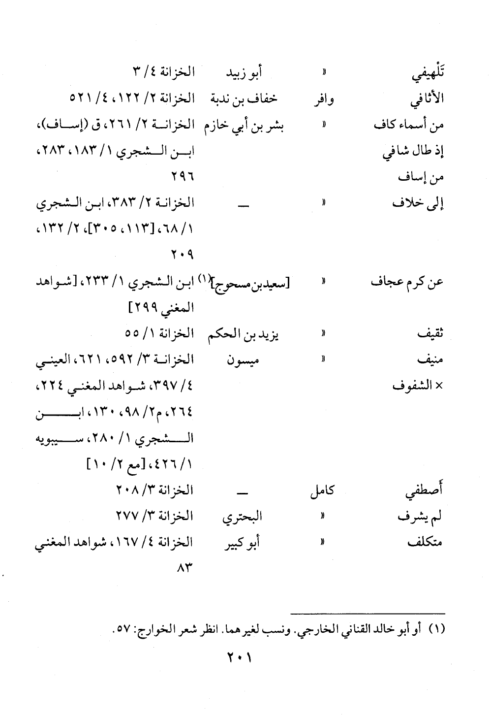 تَلْهيفي « أبو زبيد الخزانة ٤/ ٣الأثافي وافر خفاف بن ندبة الخزانة ٢/ ١٢٢، ٤/ ٥٢١من أسماء كاف إذ طال شافي من إساف « بشر بن أبي خازم الخزانة ٢/ ٢٦١، ق (إساف)، ابن الشجري ١/ ١٨٣، ٢٨٣، ٢٩٦ إلى خلاف « ــ الخزانة ٢/ ٣٨٣، ابن الشجري ١/ ٦٨، [١١٣، ٣٠٥]، ٢/ ١٣٢، ٢٠٩عن كرم عجاف « [سعيد بن مسحوج] (¬١) ابن الشجري ١/ ٢٣٣، [شواهد المغني ٢٩٩]ثقيف « يزيد بن الحكم الخزانة ١/ ٥٥منيف × الشفوف « ميسون الخزانة ٣/ ٥٩٢، ٦٢١، العيني ٤/ ٣٩٧، شواهد المغني ٢٢٤، ٢٦٤، م ٢/ ٩٨، ١٣٠، ابن الشجري ١/ ٢٨٠، سيبويه ١/ ٤٢٦، [مع ٢/ ١٠]أَصطفي كامل ــ الخزانة ٣/ ٢٠٨لم يشرف « البحتري الخزانة ٣/ ٢٧٧متكلف « أبو كبير الخزانة ٤/ ١٦٧، شواهد المغني ٨٣