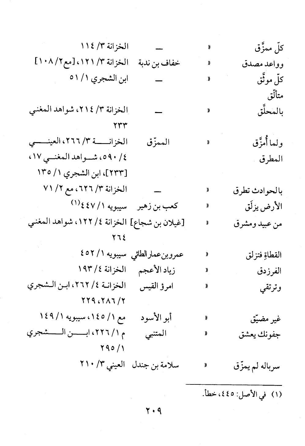 كلّ ممزَّق « ــ الخزانة ٣/ ١١٤وواعد مصدق « خفاف بن ندبة الخزانة ٣/ ١٢١، [مع ٢/ ١٠٨]كلّ موثَّق متألّق « ــ ابن الشجري ١/ ٥١ بالمحلَّق « ــ الخزانة ٣/ ٢١٤، شواهد المغني ٢٣٣ولما أُمزَّق المطرق « الممزّق الخزانة ٣/ ٢٦٦، العيني ٤/ ٥٩٠، شواهد المغني ١٧، [٢٣٣]، ابن الشجري ١/ ١٣٥بالحوادث تطرق « ــ الخزانة ٣/ ٦٢٦، مع ٢/ ٧١الأرض يزلَق « كعب بن زهير سيبويه ١/ ٤٤٧ (¬١)من عبيد ومشرق « [غيلان بن شجاع] الخزانة ٤/ ١٢٢، شواهد المغني ٢٦٤القطاةِ فتزلق « عمرو بن عمار الطائي سيبويه ١/ ٤٥٢الفرزدق « زياد الأعجم الخزانة ٤/ ١٩٣وترتقي « امرؤ القيس الخزانة ٤/ ٢٦٢، ابن الشجري ٢/ ٢٨٦، ٢٢٩غير مضيّق « أبو الأسود مع ١/ ١٤٥، سيبويه ١/ ١٤٩جفونك يعشق « المتنبي م ١/ ٢٢٦، ابن الشجري ١/ ٢٩٥سرباله لم يمزّق « سلامة بن جندل العيني ٣/ ٢١٠
