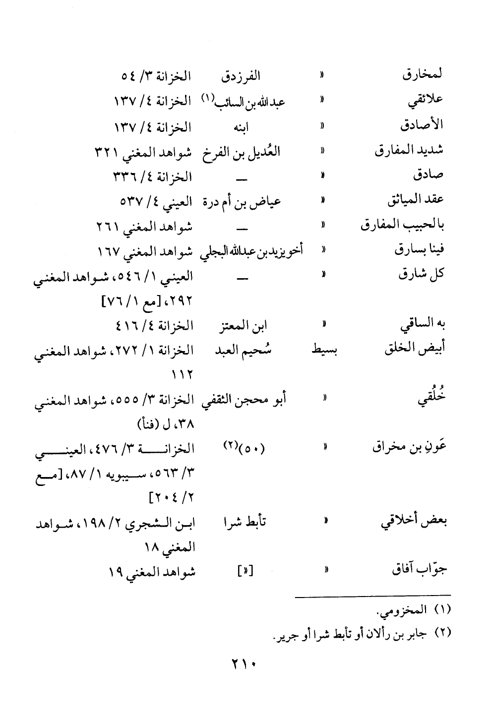 لمخارق « الفرزدق الخزانة ٣/ ٥٤علائقي « عبد الله بن السائب (¬١) الخزانة ٤/ ١٣٧الأصادق « ابنه الخزانة ٤/ ١٣٧شديد المفارق « العُديل بن الفرخ شواهد المغني ٣٢١صادق « ــ الخزانة ٤/ ٣٣٦عقد المياثق « عياض بن أم درة العيني ٤/ ٥٣٧بالحبيب المفارق « ــ شواهد المغني ٢٦١فينا بسارق « أخو يزيد بن عبدالله البجلي شواهد المغني ١٦٧كل شارق « ــ العيني ١/ ٥٤٦، شواهد المغني ٢٩٢، [مع ١/ ٧٦]به الساقي « ابن المعتز الخزانة ٤/ ٤١٦أبيض الخلق بسيط سُحيم العبد الخزانة ١/ ٢٧٢، شواهد المغني ١١٢خُلُقي « أبو محجن الثقفي الخزانة ٣/ ٥٥٥، شواهد المغني ٣٨، ل (فنأ)عَونِ بن مخراق « (٥٠) (¬٢) الخزانة ٣/ ٤٧٦، العيني ٣/ ٥٦٣، سيبويه ١/ ٨٧، [مع ٢/ ٢٠٤]بعض أخلاقي « تأبط شرا ابن الشجري ٢/ ١٩٨، شواهد المغني ١٨جوّاب آفاق « [«] شواهد المغني ١٩
