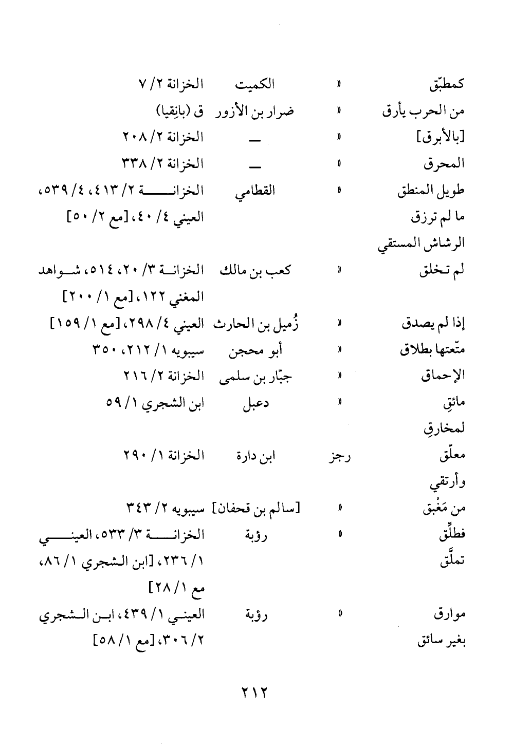 كمطبّق « الكميت الخزانة ٢/ ٧من الحرب يأرق « ضرار بن الأزور ق (بانِقيا)[بالأبرق] « ــ الخزانة ٢/ ٢٠٨المحرق « ــ الخزانة ٢/ ٣٣٨طويل المنطق ما لم ترزق الرشاش « القطامي الخزانة ٢/ ٤١٣، ٤/ ٥٣٩، العيني ٤/ ٤٠، [مع ٢/ ٥٠] المستقيلم تخلق « كعب بن مالك الخزانة ٣/ ٢٠، ٥١٤، شواهد المغني ١٢٢، [مع ١/ ٢٠٠]إذا لم يصدق « زُميل بن الحارث العيني ٤/ ٢٩٨، [مع ١/ ١٥٩]متّعتها بطلاق « أبو محجن سيبويه ١/ ٢١٢، ٣٥٠الإحماق « جبّار بن سلمى الخزانة ٢/ ٢١٦مائقِلمخارق « دعبل ابن الشجري ١/ ٥٩معلّق وأرتقي رجز ابن دارة الخزانة ١/ ٢٩٠من مَغْبق « [سالم بن قحفان] سيبويه ٢/ ٣٤٣فطلِّقتملَّق « رؤبة الخزانة ٣/ ٥٣٣، العيني ١/ ٢٣٦، [ابن الشجري ١/ ٨٦، مع ١/ ٢٨]موارقبغير سائق « رؤبة العيني ١/ ٤٣٩، ابن الشجري ٢/ ٣٠٦، [مع ١/ ٥٨]