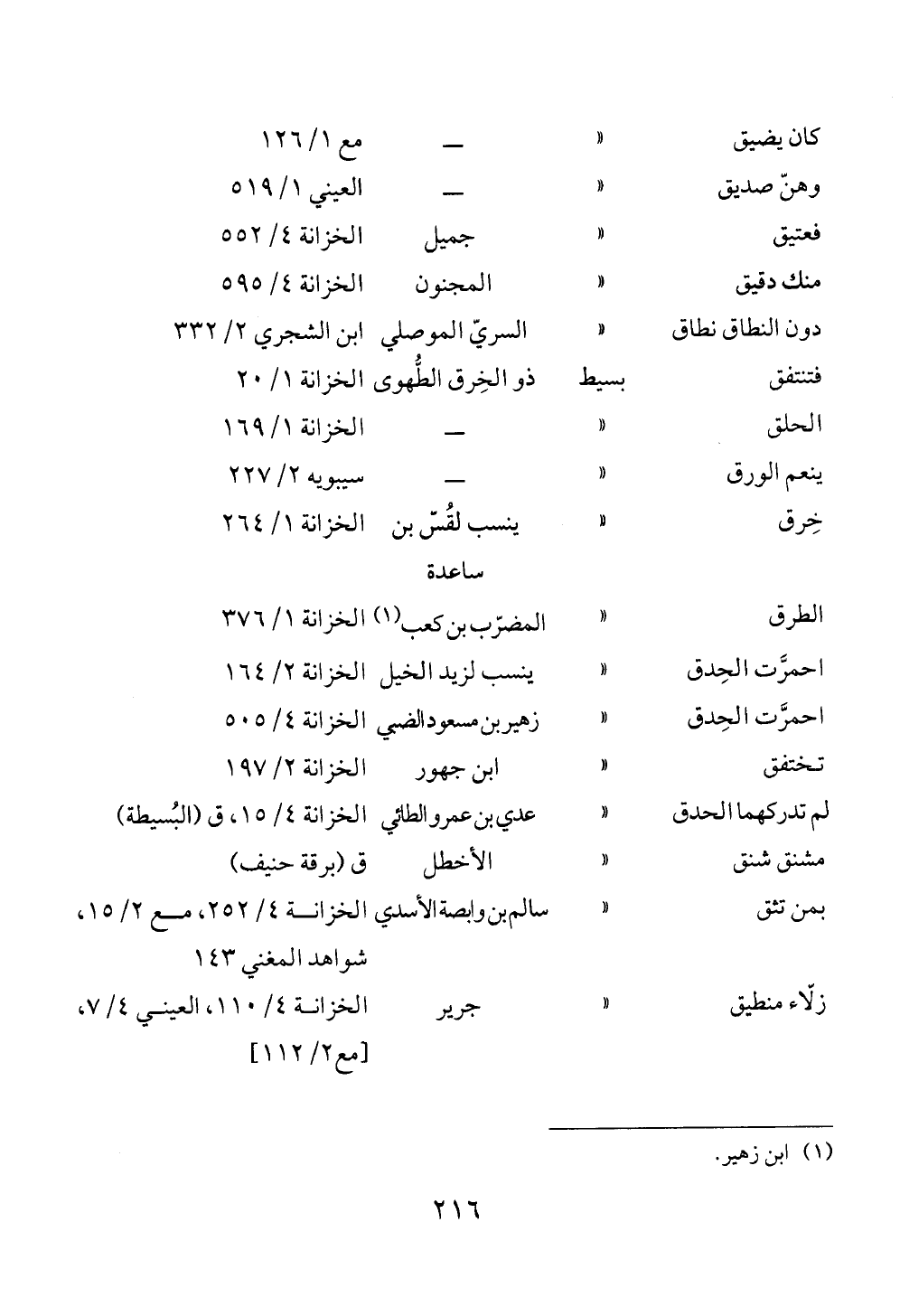 كان يضيق « ــ مع ١/ ١٢٦وهنّ صديق « ــ العيني ١/ ٥١٩فعتيق « جميل الخزانة ٤/ ٥٥٢منك دقيق « المجنون الخزانة ٤/ ٥٩٥دون النطاق نطاق « السريّ الموصلي ابن الشجري ٢/ ٣٣٢فتنتفق بسيط ذو الخِرق الطُّهوى الخزانة ١/ ٢٠الحلق « ــ الخزانة ١/ ١٦٩ينعم الورق « ــ سيبويه ٢/ ٢٢٧خِرق « ينسب لقُسّ بن ساعدة الخزانة ١/ ٢٦٤الطرق « المضرّب بن كعب (¬١) الخزانة ١/ ٣٧٦احمرَّت الحِدق « ينسب لزيد الخيل الخزانة ٢/ ١٦٤احمرَّت الحِدق « زهير بن مسعود الضبي الخزانة ٤/ ٥٠٥تختفق « ابن جهور الخزانة ٢/ ١٩٧لم تدركهما الحدق « عدي بن عمرو الطائي الخزانة ٤/ ١٥، ق (البُسيطة)مشنق شنق « الأخطل ق (برقة حنيف)بمن تثق « سالم بن وابصة الأسدي الخزانة ٤/ ٢٥٢، مع ٢/ ١٥، شواهد المغني ١٤٣زلّاء منطيق « جرير الخزانة ٤/ ١١٠، العيني ٤/ ٧، [مع ٢/ ١١٢]