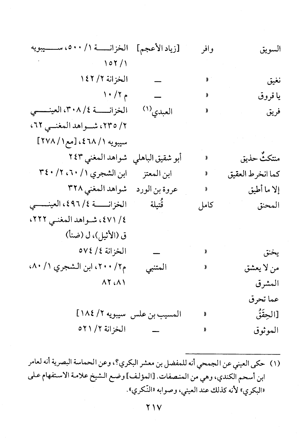 السويق وافر [زياد الأعجم] الخزانة ١/ ٥٠٠، سيبويه ١/ ١٥٢نغيق « ــ الخزانة ٢/ ١٤٢يا قروق « ــ م ٢/ ١٠فريق « العبدي (¬١) الخزانة ٤/ ٣٠٨، العيني ٢/ ٢٣٥، شواهد المغني ٦٢، سيبويه ١/ ٤٦٨، [مع ١/ ٢٧٨]منتكثٌ حذيق « أبو شقيق الباهلي شواهد المغني ٢٤٣كما انخرط العقيق « ابن المعتز ابن الشجري ١/ ٦٠، ٢/ ٣٤٠إلا ما أطيق « عروة بن الورد شواهد المغني ٣٢٨المحنق كامل قُتيلة الخزانة ٤/ ٤٩٦، العيني ٤/ ٤٧١، شواهد المغني ٢٢٢، ق (الأثيل)، ل (ضنأ)يخنق « ــ الخزانة ٤/ ٥٧٤من لا يعشقالمشرق عما تحرق « المتنبي م ٢/ ٢٠٠، ابن الشجري ١/ ٨٠، ٨١، ٨٢ [الحِقَقُ « المسيب بن علس سيبويه ٢/ ١٨٤]الموثوق « ــ الخزانة ٢/ ٥٢١