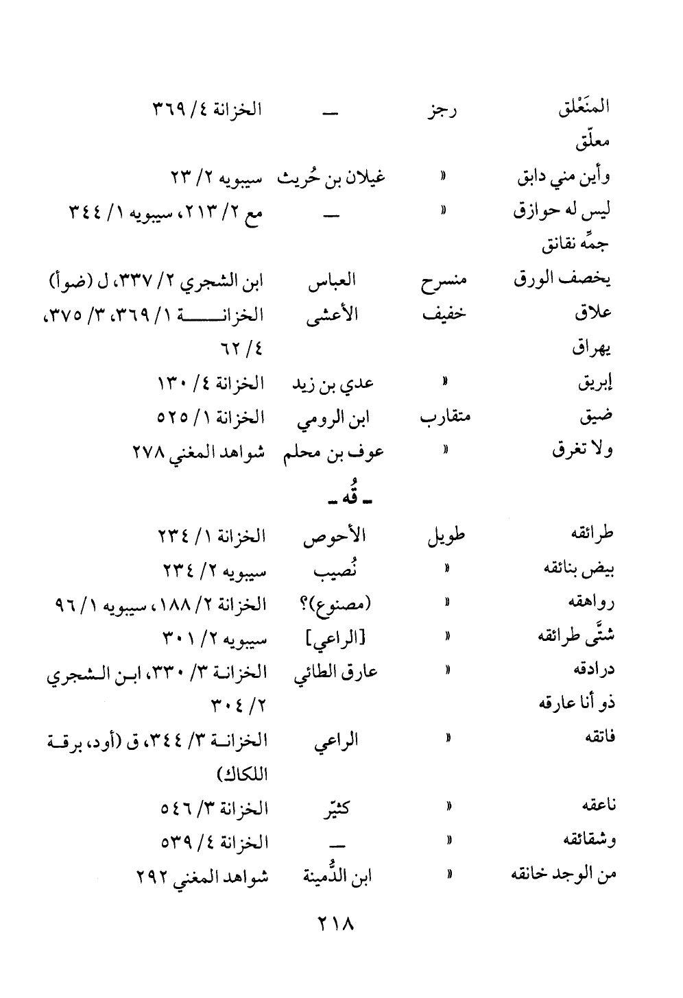 طرائقه طويل الأحوص الخزانة ١/ ٢٣٤بيض بنائقه « نُصيب سيبويه ٢/ ٢٣٤رواهقه « (مصنوع)؟ الخزانة ٢/ ١٨٨، سيبويه ١/ ٩٦شتَّى طرائقه « [الراعي] سيبويه ٢/ ٣٠١درادقهذو أنا عارقه « عارق الطائي الخزانة ٣/ ٣٣٠، ابن الشجري ٢/ ٣٠٤ فاتقه « الراعي الخزانة ٣/ ٣٤٤، ق (أود، برقة اللكاك)ناعقه « كثيّر الخزانة ٣/ ٥٤٦وشقائقه « ــ الخزانة ٤/ ٥٣٩من الوجد خانقه « ابن الدُّمينة شواهد المغني ٢٩٢
