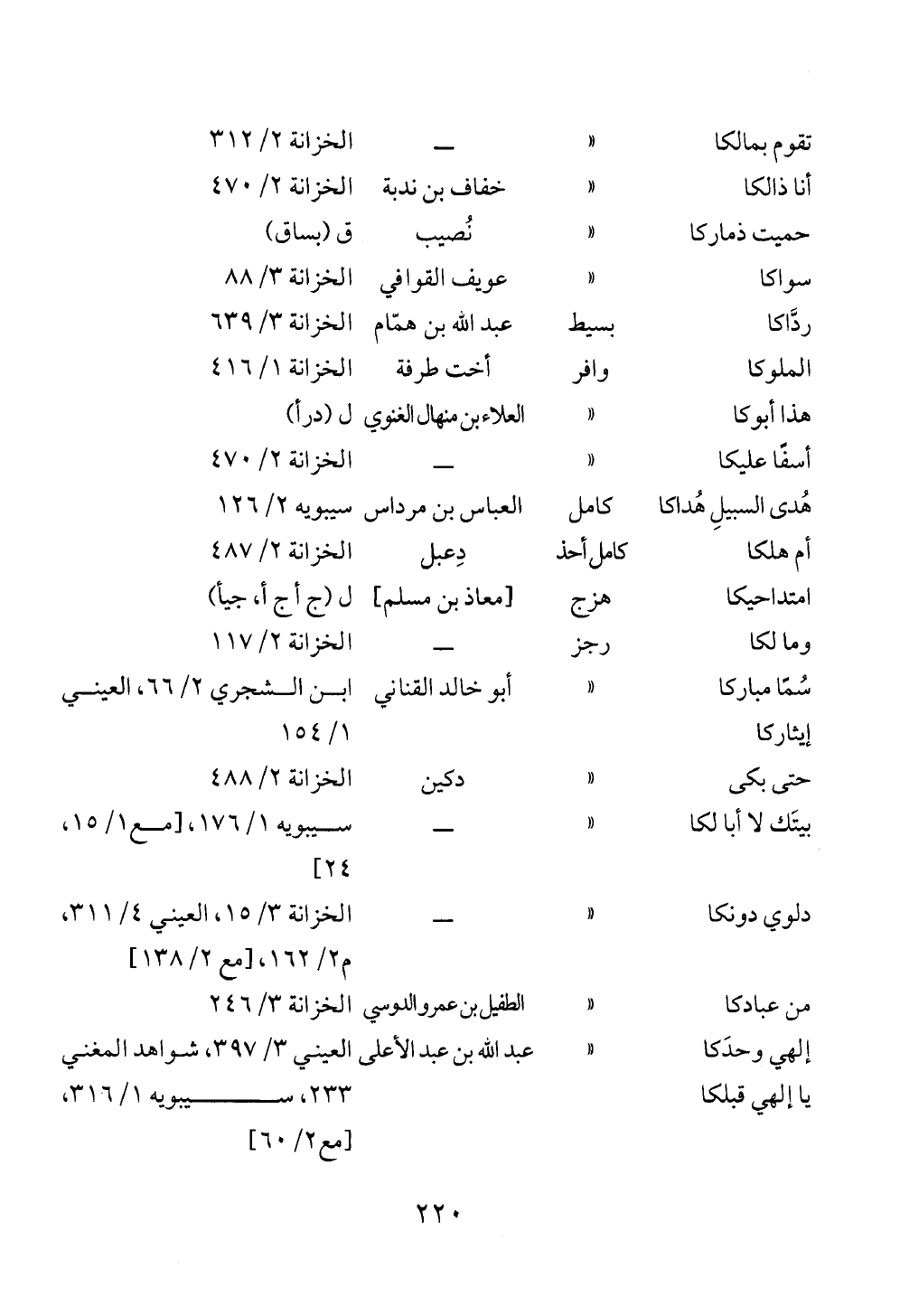 تقوم بمالكا « ــ الخزانة ٢/ ٣١٢أنا ذالكا « خفاف بن ندبة الخزانة ٢/ ٤٧٠حميت ذماركا « نُصيب ق (بساق)سواكا « عويف القوافي الخزانة ٣/ ٨٨ردَّاكا بسيط عبد الله بن همّام الخزانة ٣/ ٦٣٩الملوكا وافر أخت طرفة الخزانة ١/ ٤١٦هذا أبوكا « العلاء بن منهال الغنوي ل (درأ)أسفًا عليكا « ــ الخزانة ٢/ ٤٧٠هُدى السبيلِ هُداكا كامل العباس بن مرداس سيبويه ٢/ ١٢٦أم هلكا كامل أحذ دِعبل الخزانة ٢/ ٤٨٧امتداحيكا هزج [معاذ بن مسلم] ل (ج أج أ، جيأ)وما لكا رجز ــ الخزانة ٢/ ١١٧سُمًا مباركاإيثاركا « أبو خالد القناني ابن الشجري ٢/ ٦٦، العيني ١/ ١٥٤ حتى بكى « دكين الخزانة ٢/ ٤٨٨بيتَك لا أبا لكا « ــ سيبويه ١/ ١٧٦، [مع ١/ ١٥، ٢٤]دلوي دونكا « ــ الخزانة ٣/ ١٥، العيني ٤/ ٣١١، م ٢/ ١٦٢، [مع ٢/ ١٣٨]من عبادكا « الطفيل بن عمرو الدوسي الخزانة ٣/ ٢٤٦إلهي وحدَكايا إلهي قبلكا « عبد الله بن عبد الأعلى العيني ٣/ ٣٩٧، شواهد المغني ٢٣٣، سيبويه ١/ ٣١٦، [مع ٢/ ٦٠]