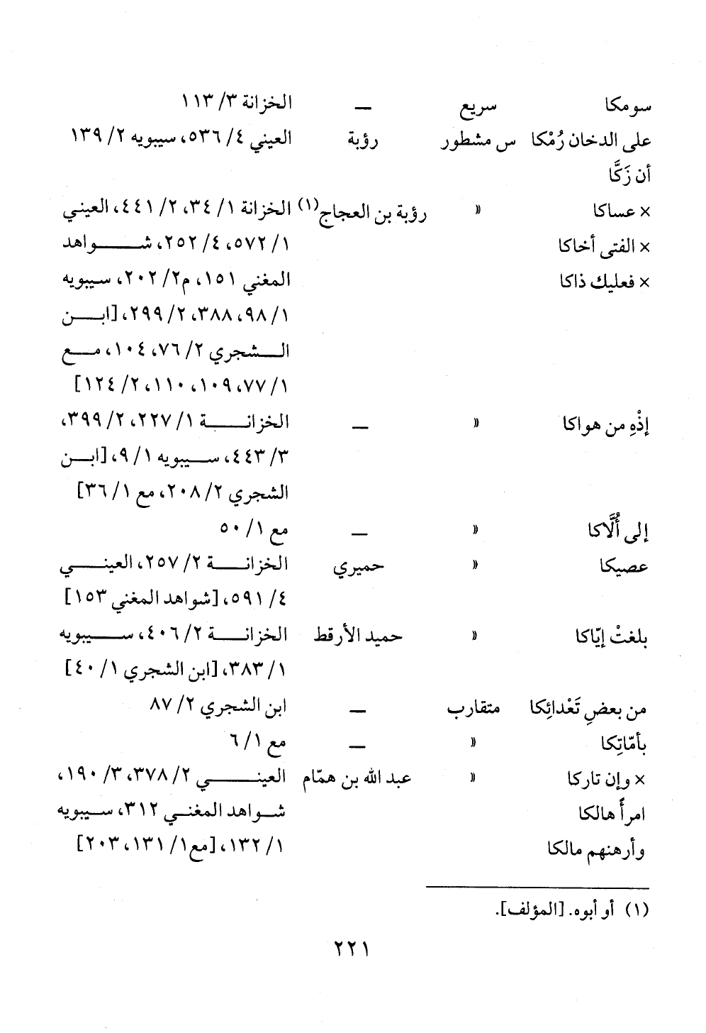 سومكا سريع ــ الخزانة ٣/ ١١٣على الدخان رُمْكاأن زَكَّا س مشطور رؤبة العيني ٤/ ٥٣٦، سيبويه ٢/ ١٣٩ × عساكا × الفتى أخاكا × فعليك ذاكا « رؤبة بن العجاج (¬١) الخزانة ١/ ٣٤، ٢/ ٤٤١، العيني ١/ ٥٧٢، ٤/ ٢٥٢، شواهد المغني ١٥١، م ٢/ ٢٠٢، سيبويه ١/ ٩٨، ٣٨٨، ٢/ ٢٩٩، [ابن الشجري ٢/ ٧٦، ١٠٤، مع ١/ ٧٧، ١٠٩، ١١٠، ٢/ ١٢٤] إذْهِ من هواكا « ــ الخزانة ١/ ٢٢٧، ٢/ ٣٩٩، ٣/ ٤٤٣، سيبويه ١/ ٩، [ابن الشجري ٢/ ٢٠٨، مع ١/ ٣٦]إلى أُلَّاكا « ــ مع ١/ ٥٠عصيكا « حميري الخزانة ٢/ ٢٥٧، العيني ٤/ ٥٩١، [شواهد المغني ١٥٣]بلغتْ إيّاكا « حميد الأرقط الخزانة ٢/ ٤٠٦، سيبويه ١/ ٣٨٣، [ابن الشجري ١/ ٤٠]من بعضِ تَعْدائِكا متقارب ــ ابن الشجري ٢/ ٨٧بأمّاتِكا « ــ مع ١/ ٦× وإن تاركا امرأً هالكا وأرهنهم مالكا « عبد الله بن همّام العيني ٢/ ٣٧٨، ٣/ ١٩٠، شواهد المغني ٣١٢، سيبويه ١/ ١٣٢، [مع ١/ ١٣١، ٢٠٣]