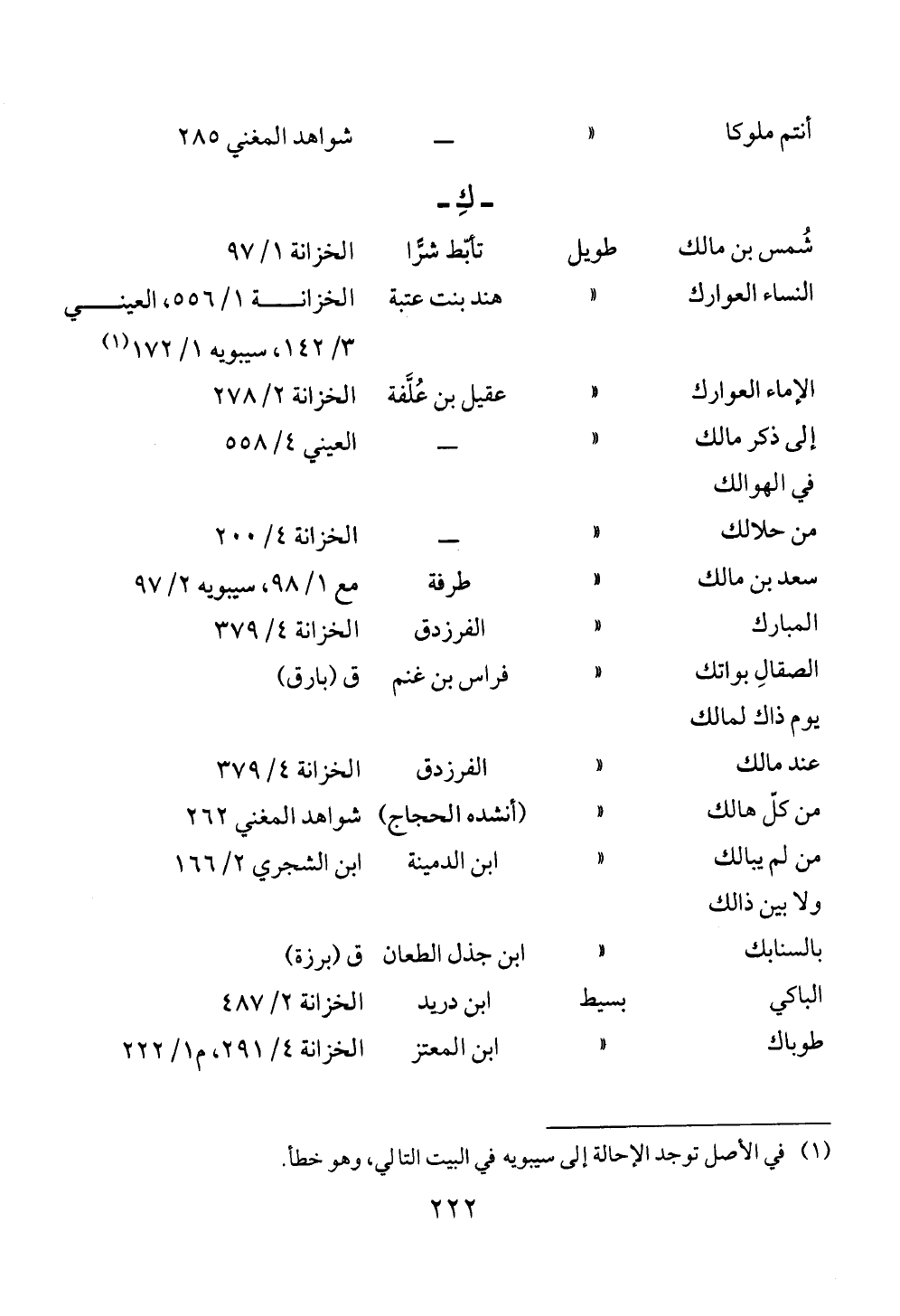 شُمس بن مالك طويل تأبّط شرًّا الخزانة ١/ ٩٧النساء العوارك « هند بنت عتبة الخزانة ١/ ٥٥٦، العيني ٣/ ١٤٢، سيبويه ١/ ١٧٢ (¬١)الإماء العوارك « عقيل بن عُلَّفة الخزانة ٢/ ٢٧٨إلى ذكر مالك في الهوالك « ــ العيني ٤/ ٥٥٨ من حلالك « ــ الخزانة ٤/ ٢٠٠سعد بن مالك « طرفة مع ١/ ٩٨، سيبويه ٢/ ٩٧المبارك « الفرزدق الخزانة ٤/ ٣٧٩الصقالِ بواتكيوم ذاك لمالك « فراس بن غنم ق (بارق) عند مالك « الفرزدق الخزانة ٤/ ٣٧٩من كلّ هالك « (أنشده الحجاج) شواهد المغني ٢٦٢من لم يبالكولا بين ذالك « ابن الدمينة ابن الشجري ٢/ ١٦٦ بالسنابك « ابن جذل الطعان ق (برزة)الباكي بسيط ابن دريد الخزانة ٢/ ٤٨٧طوباك « ابن المعتز الخزانة ٤/ ٢٩١، م ١/ ٢٢٢